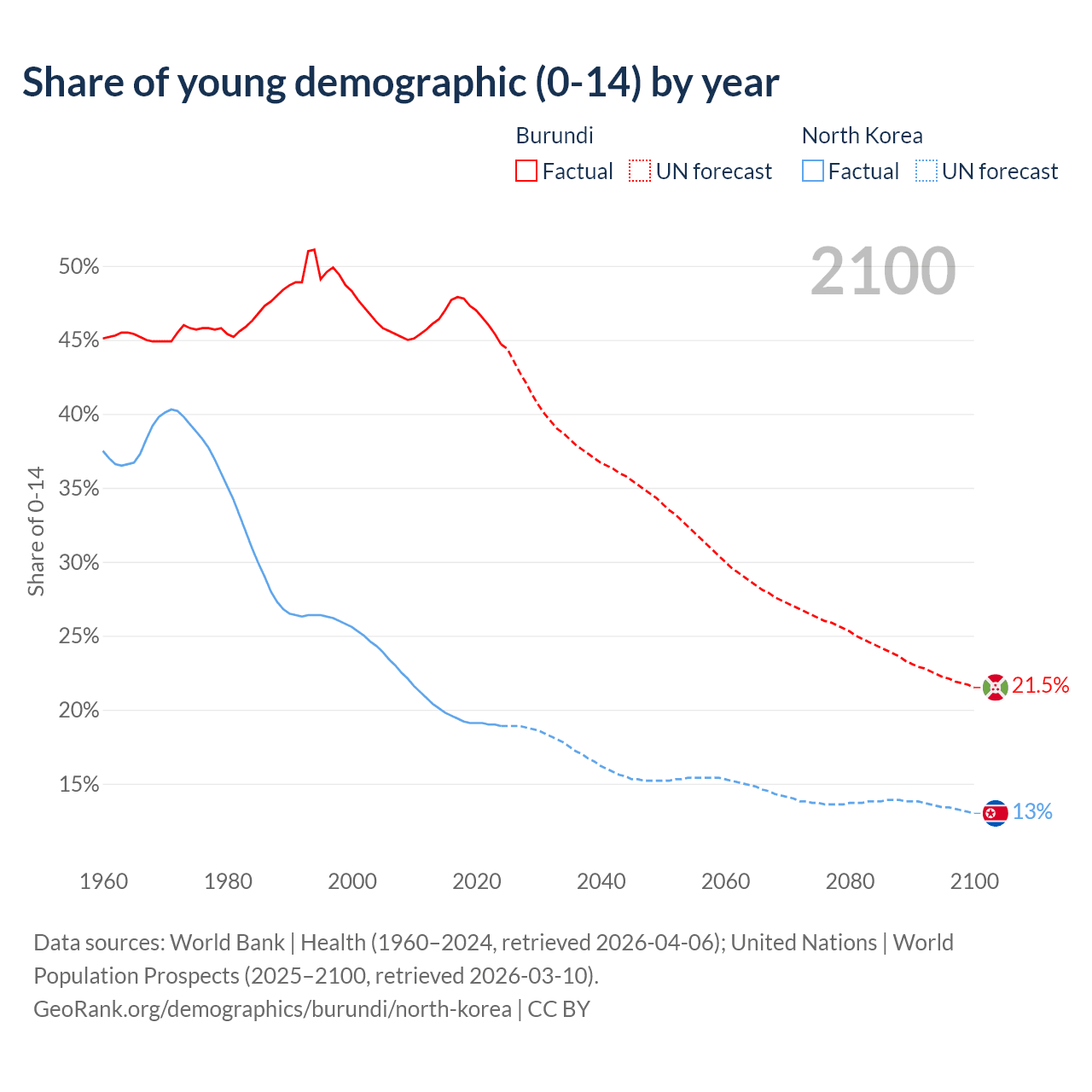 - The share of young demographic (0-15 years old) in Burundi is 44.7% vs 18.9% in North Korea.