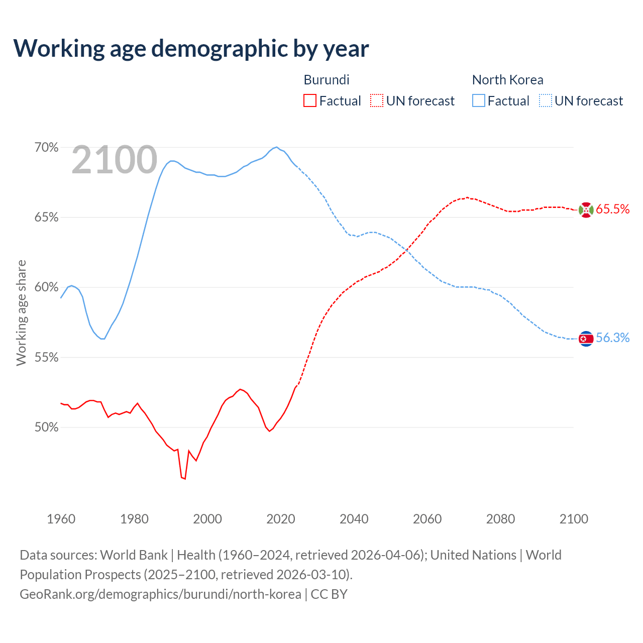 - Burundi has 7.83M working age adults (aged 15-64) vs 18.3M in North Korea.
