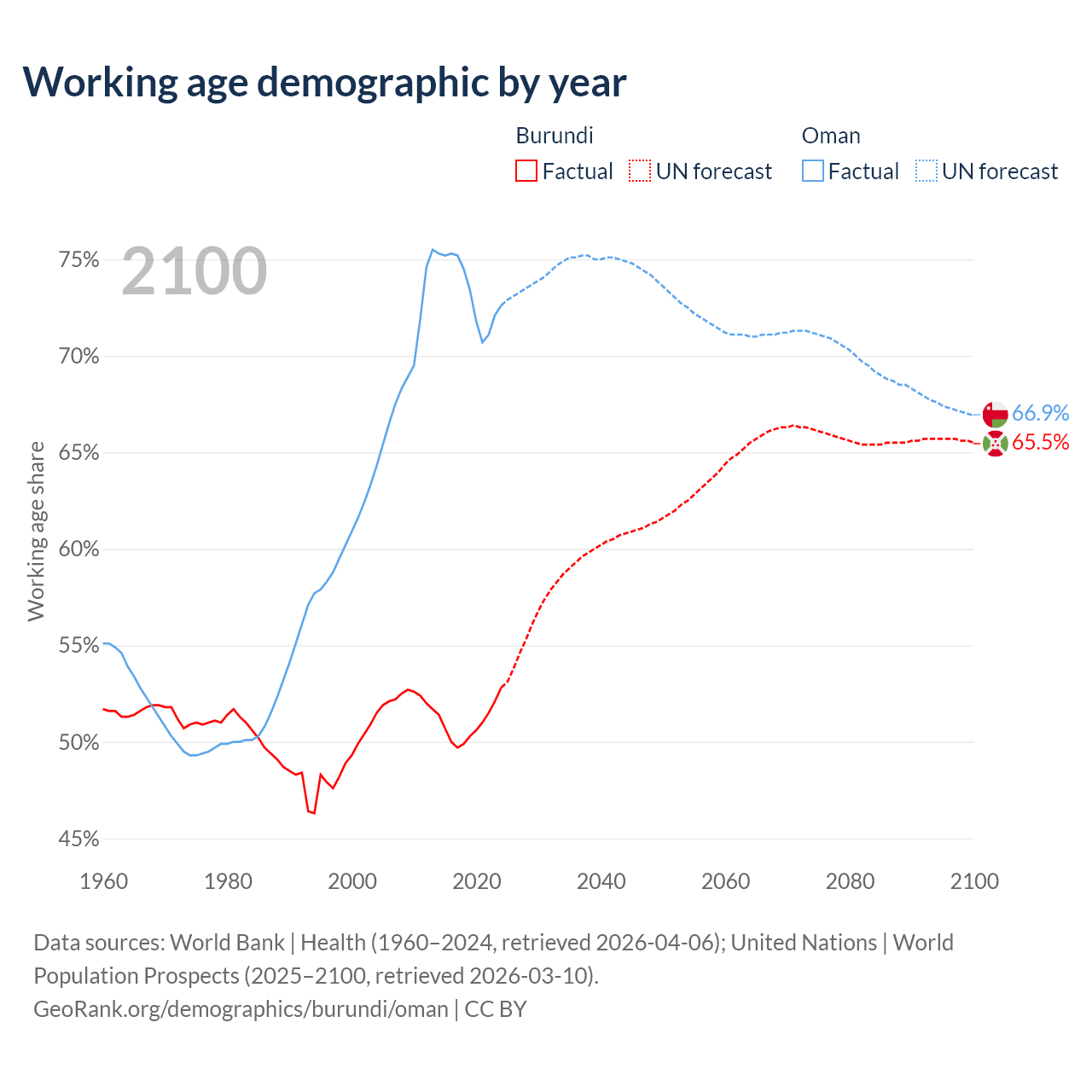 - The share of old-age demographic (65+) in Burundi is 2.53% vs 2.64% in Oman.