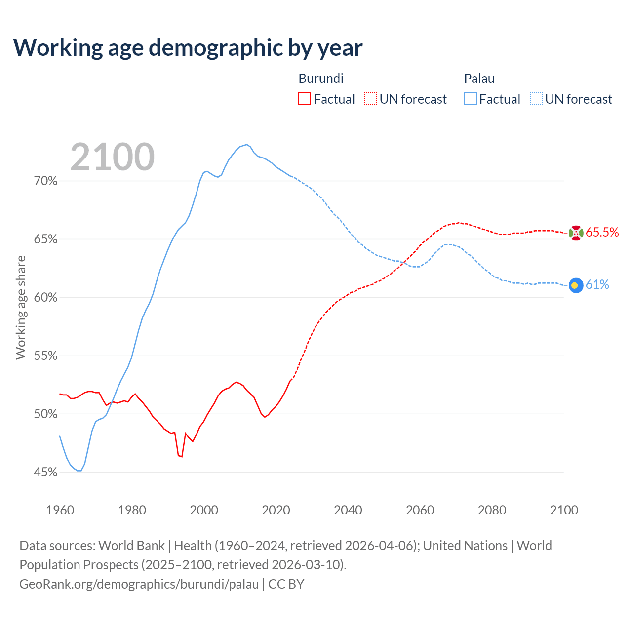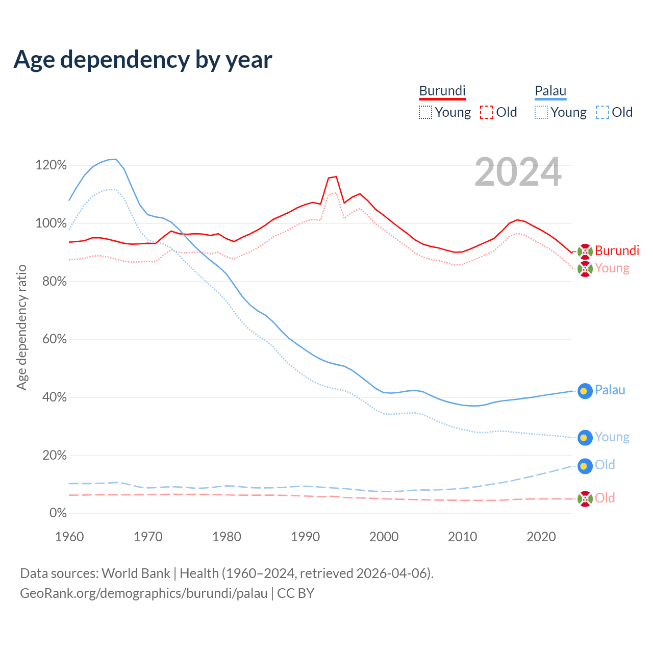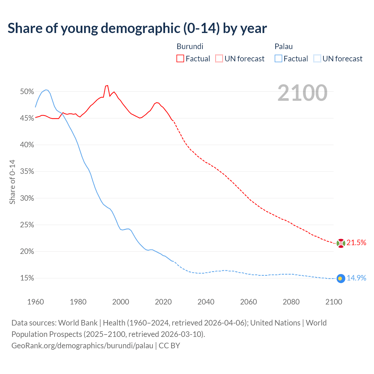 - The share of young demographic (0-15 years old) in Burundi is 44.7% vs 18.2% in Palau.
