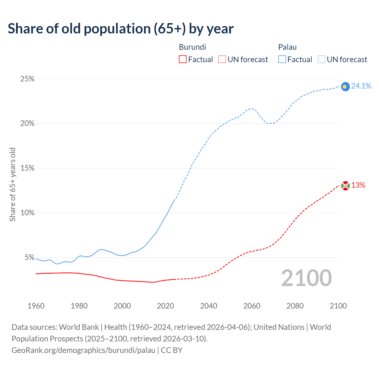 - The share of old-age demographic (65+) in Burundi is 2.53% vs 11.3% in Palau.