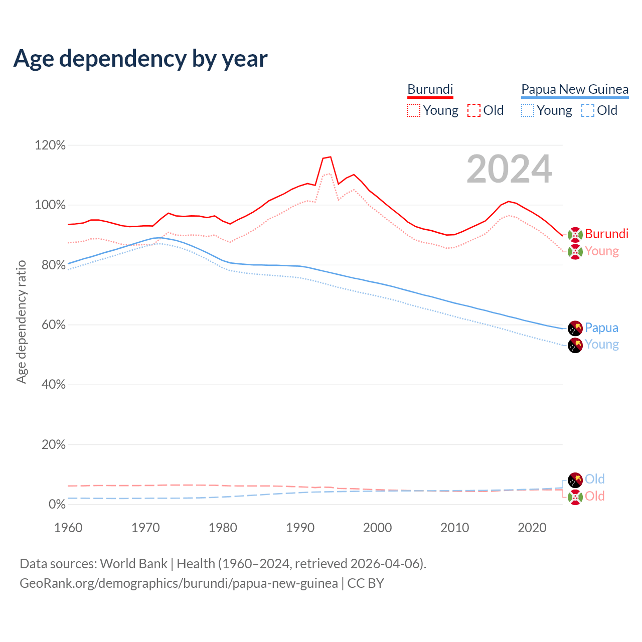 - Burundi is ranked 190/196 by median age (oldest to youngest) vs 140/196 for Papua New Guinea.