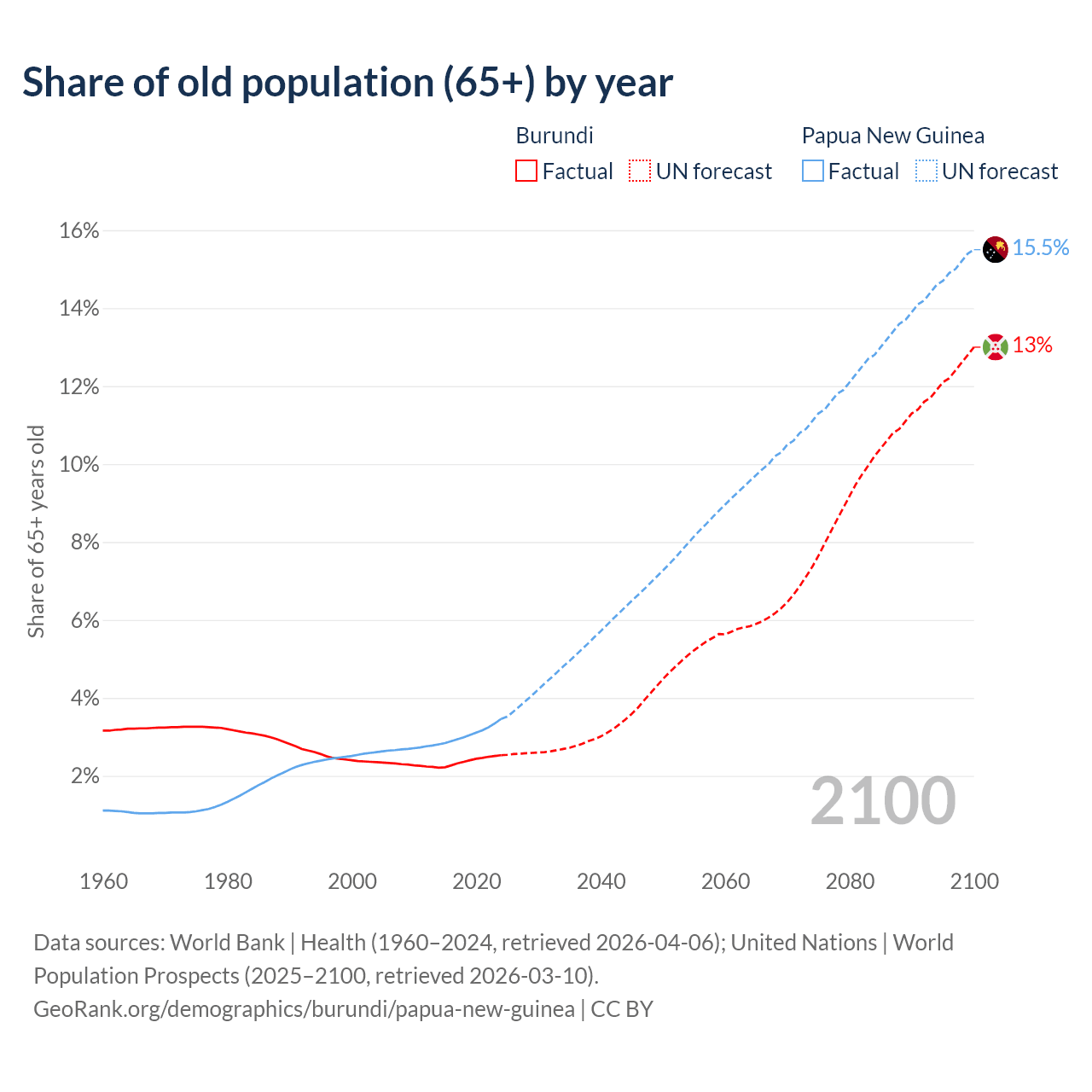 - The share of old-age demographic (65+) in Burundi is 2.53% vs 3.46% in Papua New Guinea.
