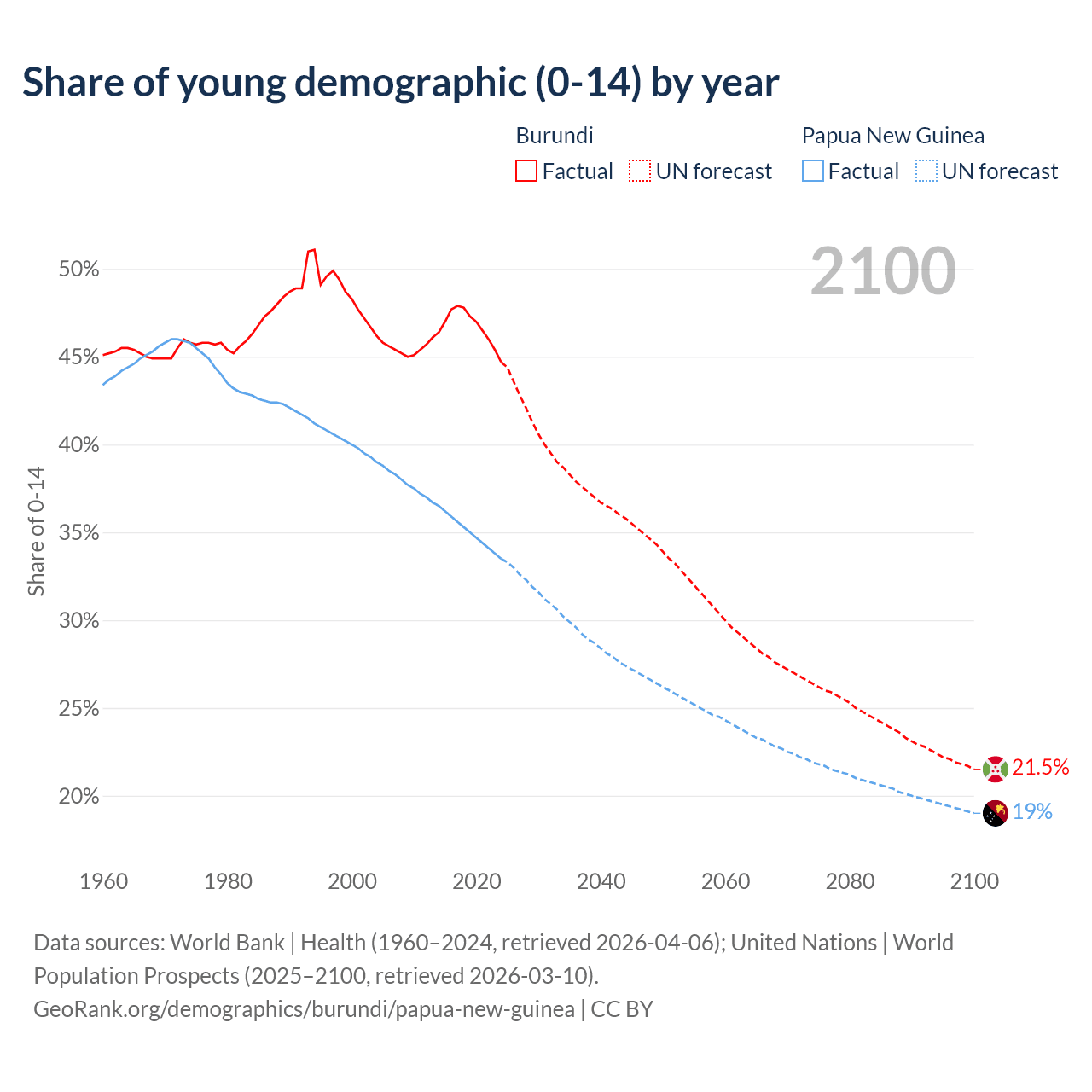 - The share of young demographic (0-15 years old) in Burundi is 44.7% vs 33.5% in Papua New Guinea.