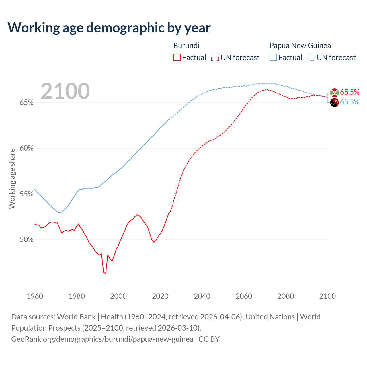 The share of older people aged 65 and over is 2.53% in Burundi and 3.46% in Papua New Guinea. Life expectancy in Burundi compared to Papua New Guinea .