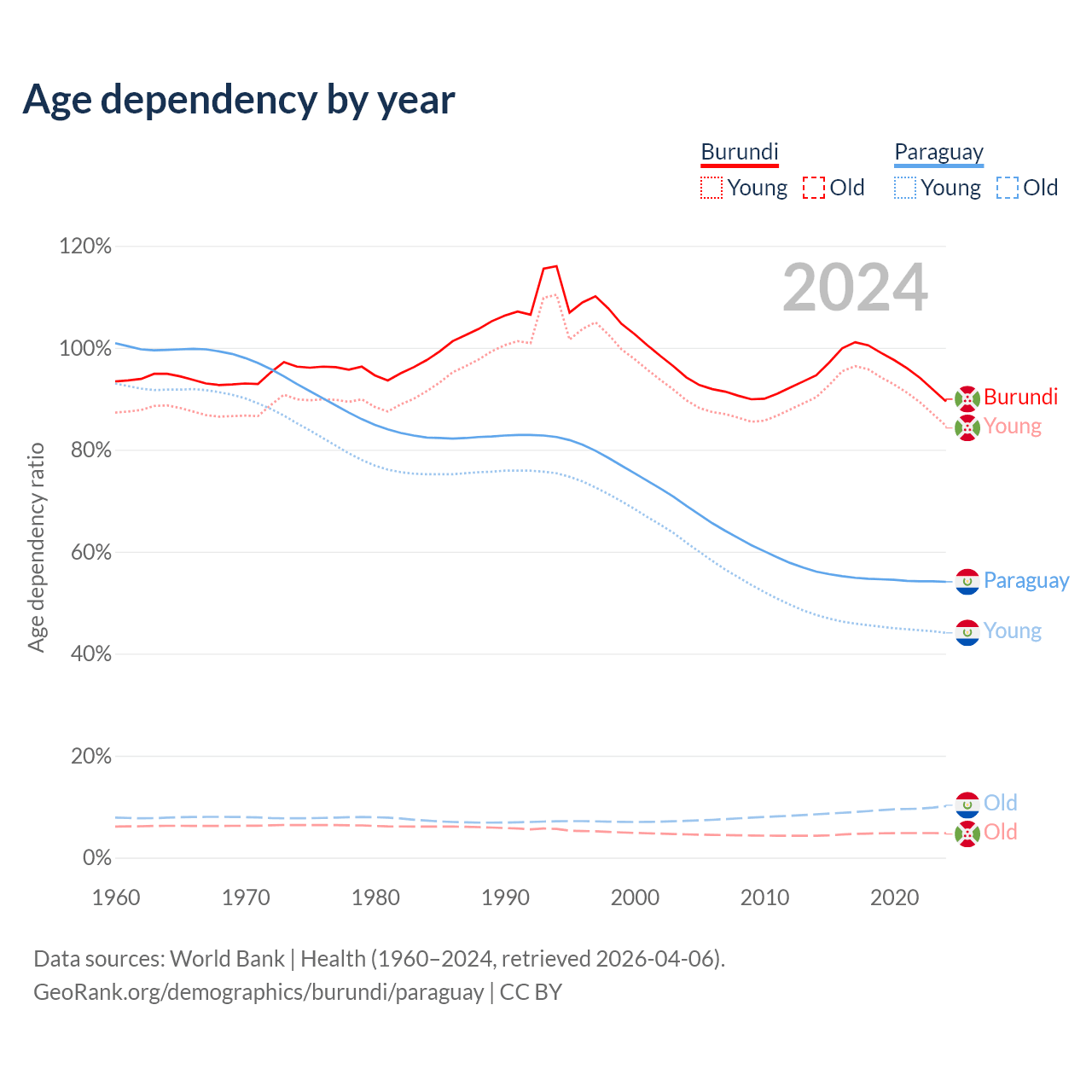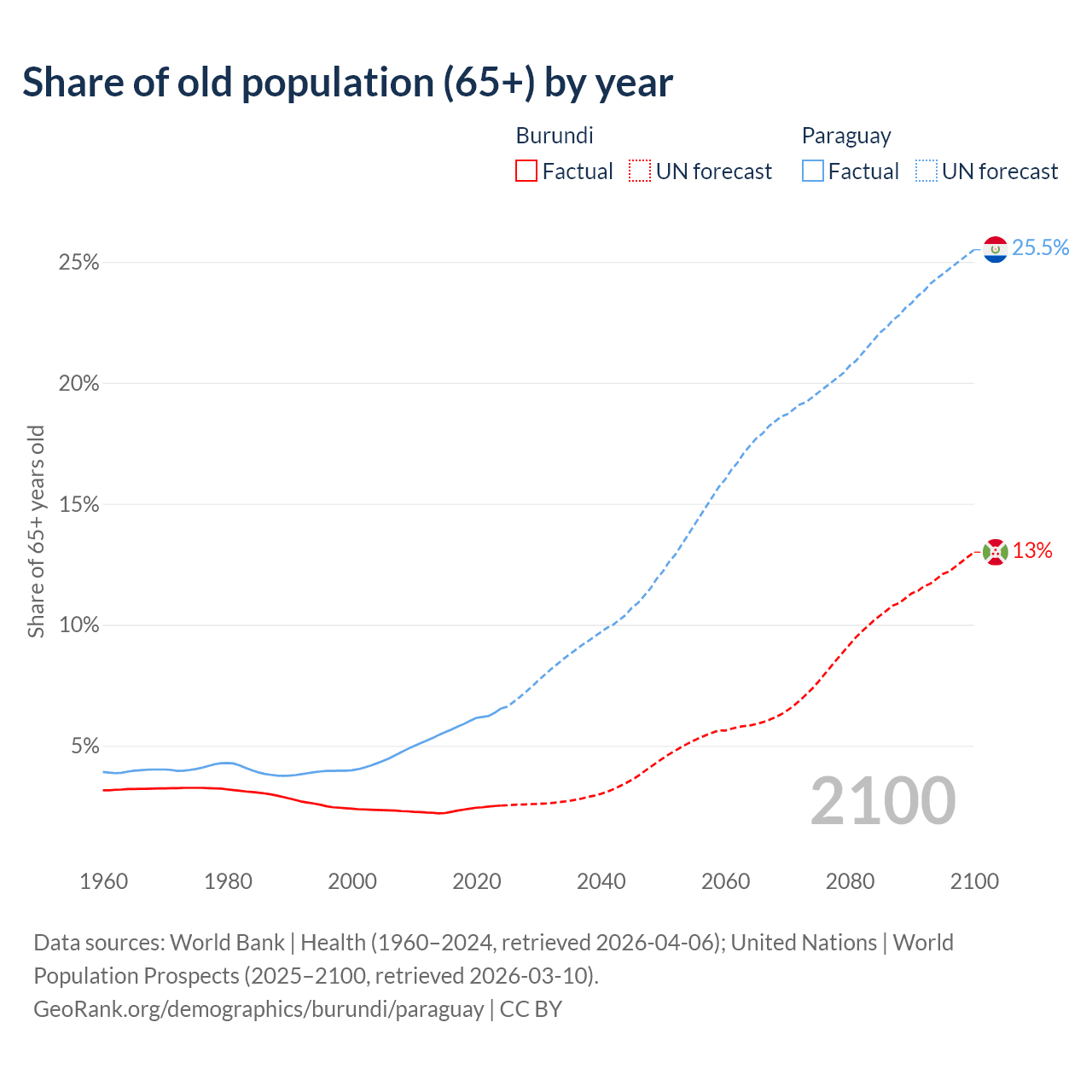 - The share of old-age demographic (65+) in Burundi is 2.53% vs 6.54% in Paraguay.