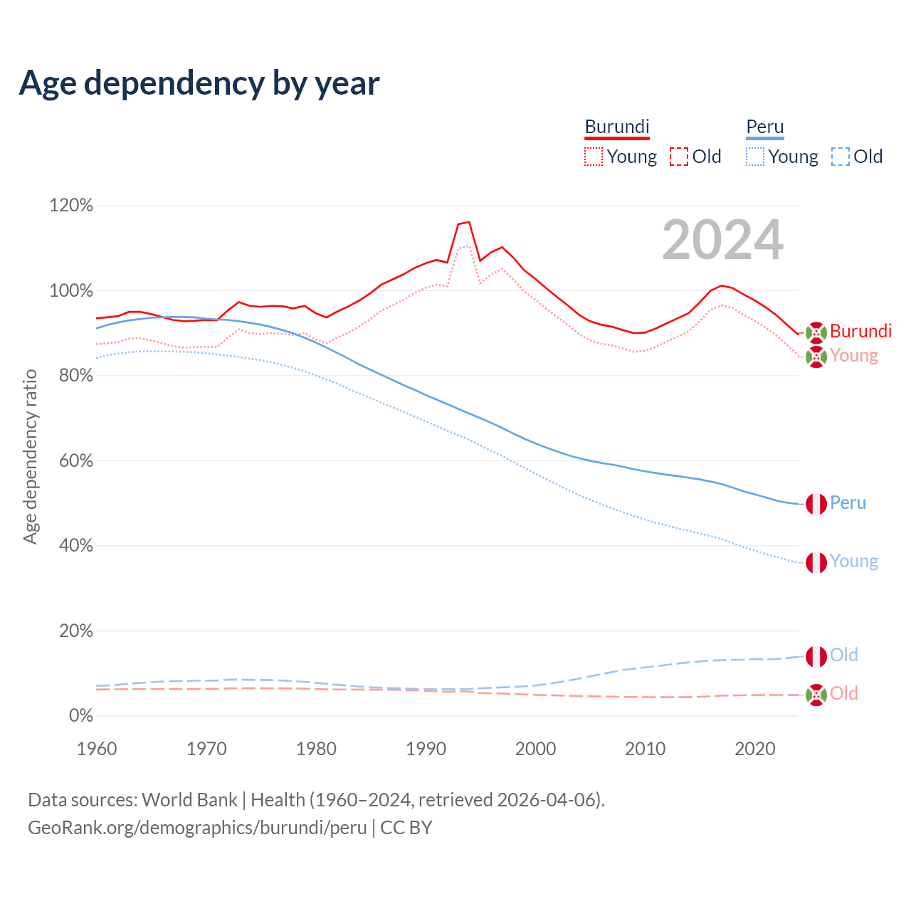 - Burundi is ranked 190/196 by median age (oldest to youngest) vs 97/196 for Peru.