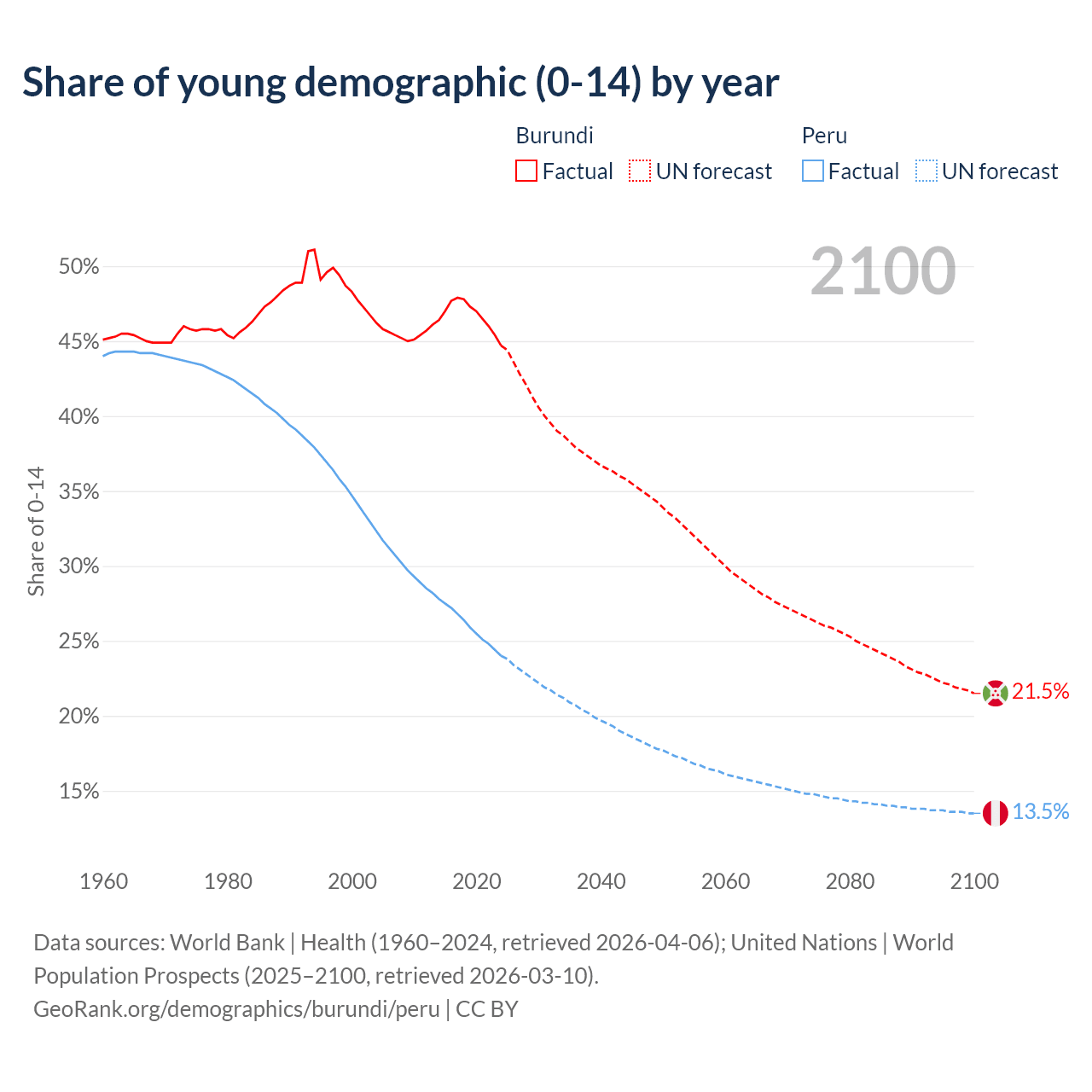- The share of young demographic (0-15 years old) in Burundi is 44.7% vs 24% in Peru.