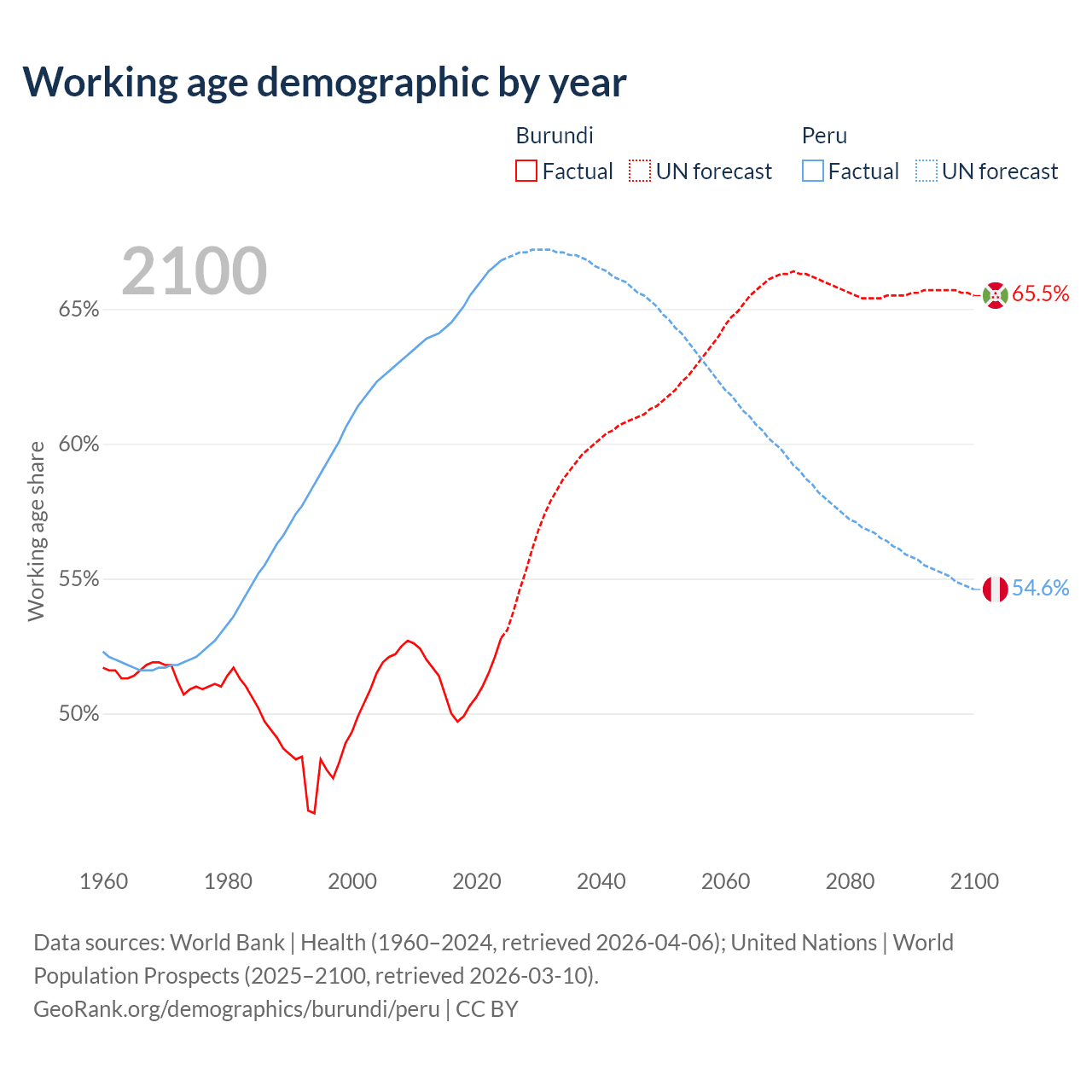 - Burundi has 7.83M working age adults (aged 15-64) vs 23.4M in Peru.