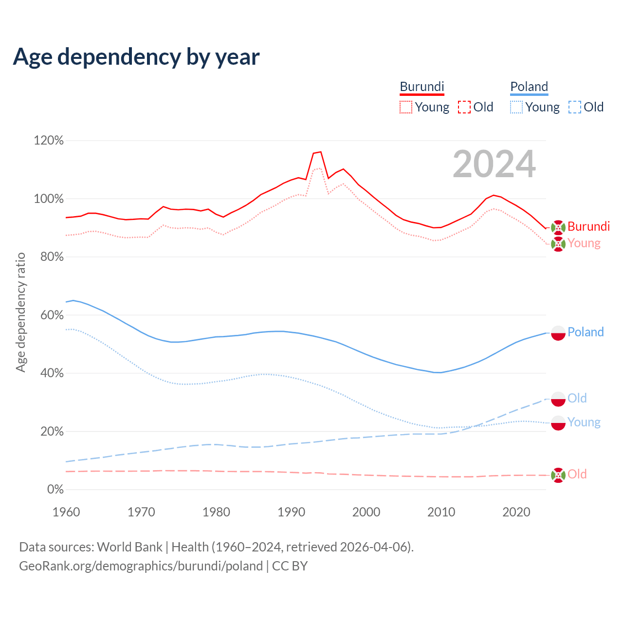 The share of older people aged 65 and over is 2.53% in Burundi and 20.1% in Poland. Life expectancy in Burundi compared to Poland .