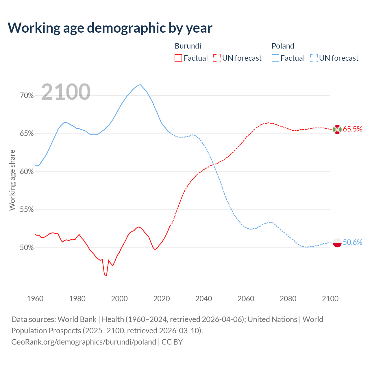 Median age Burundi vs Poland, 1960-2100
