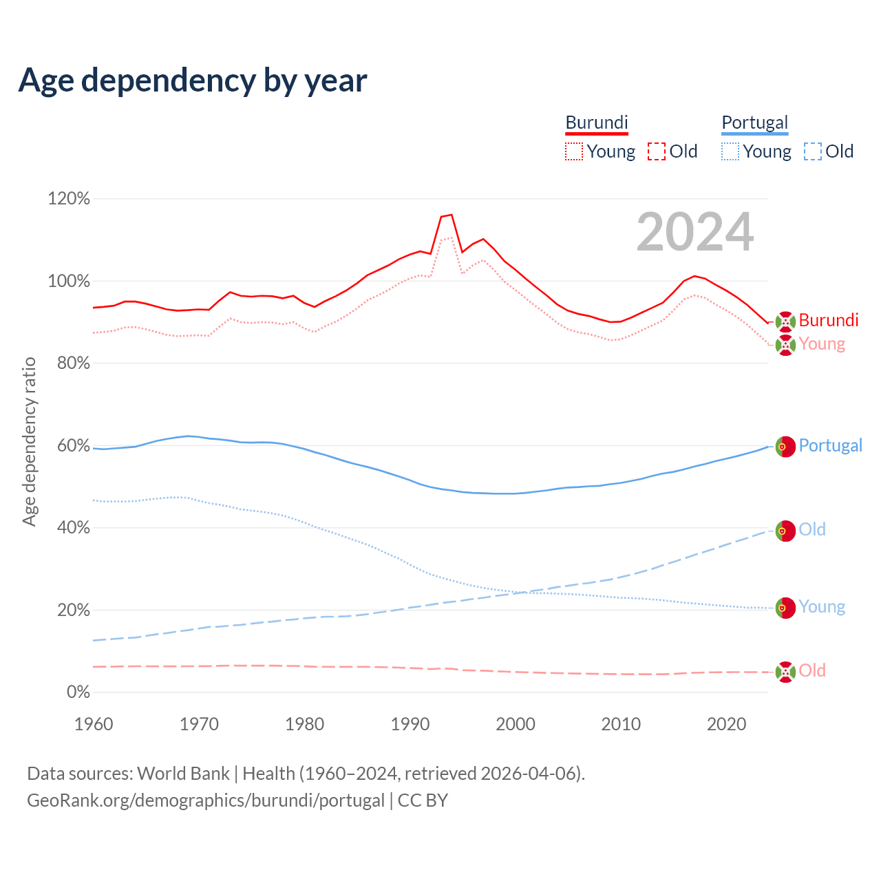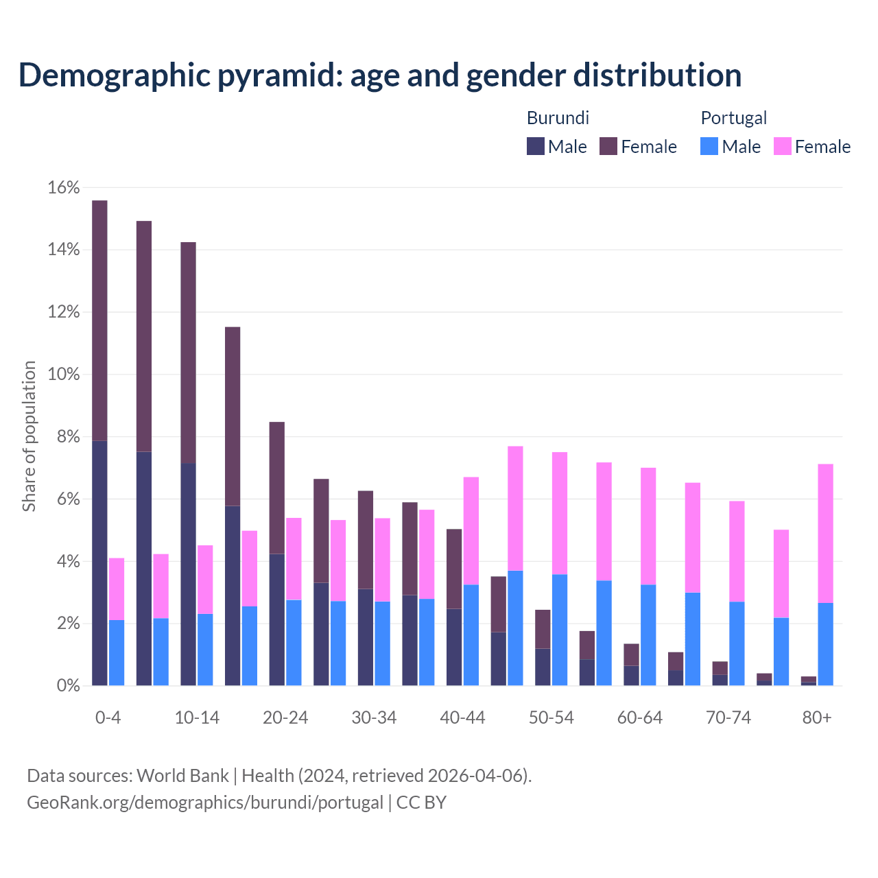 The share of older people aged 65 and over is 2.53% in Burundi and 24.5% in Portugal. Life expectancy in Burundi compared to Portugal .