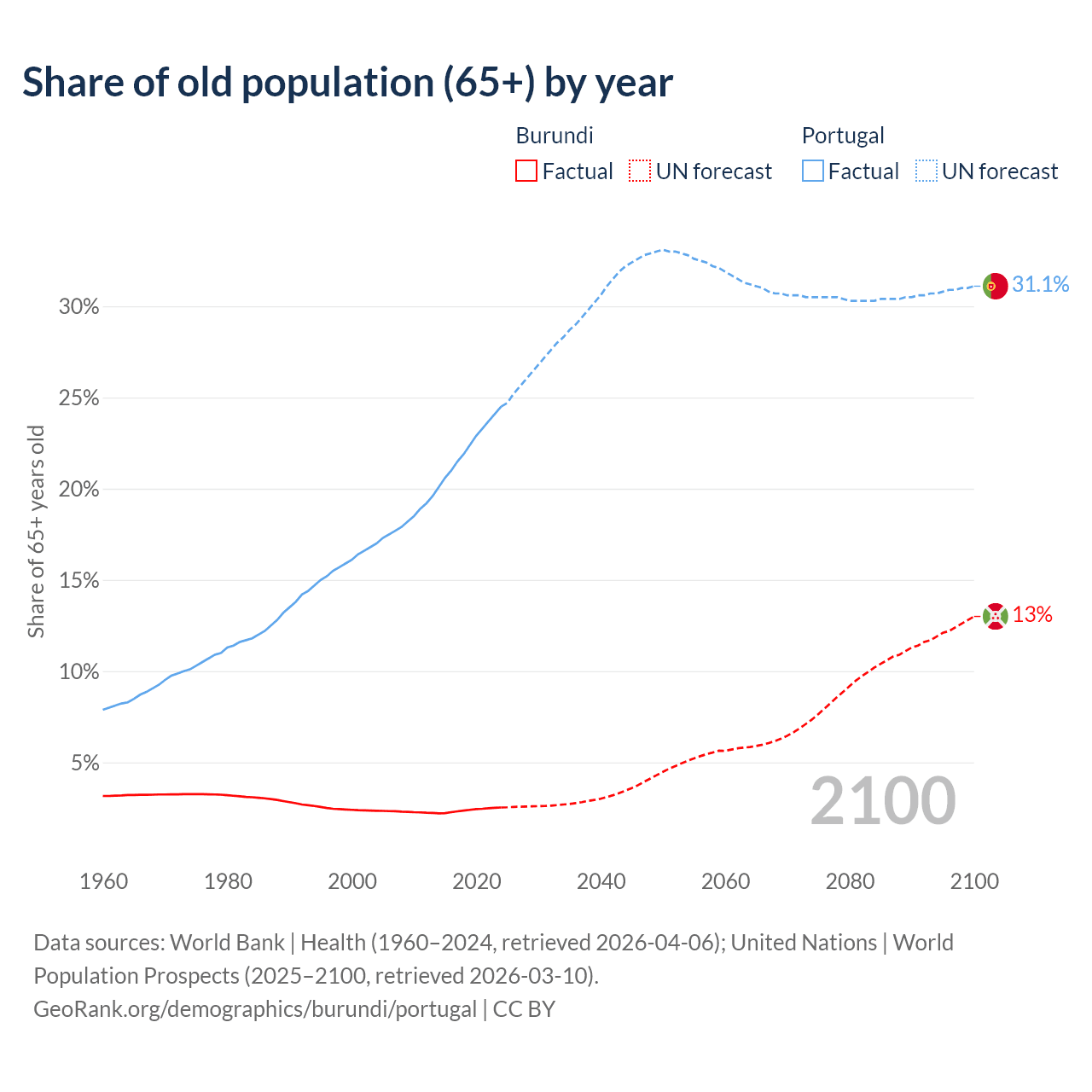 - The share of old-age demographic (65+) in Burundi is 2.53% vs 24.5% in Portugal.