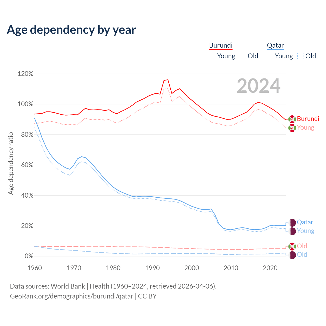 - Burundi is ranked 190/196 by median age (oldest to youngest) vs 78/196 for Qatar.