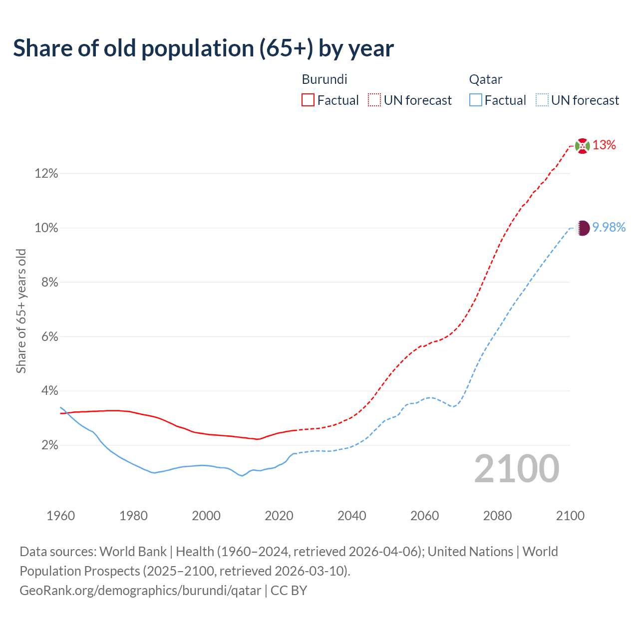 The share of older people aged 65 and over is 2.53% in Burundi and 1.68% in Qatar. Life expectancy in Burundi compared to Qatar .