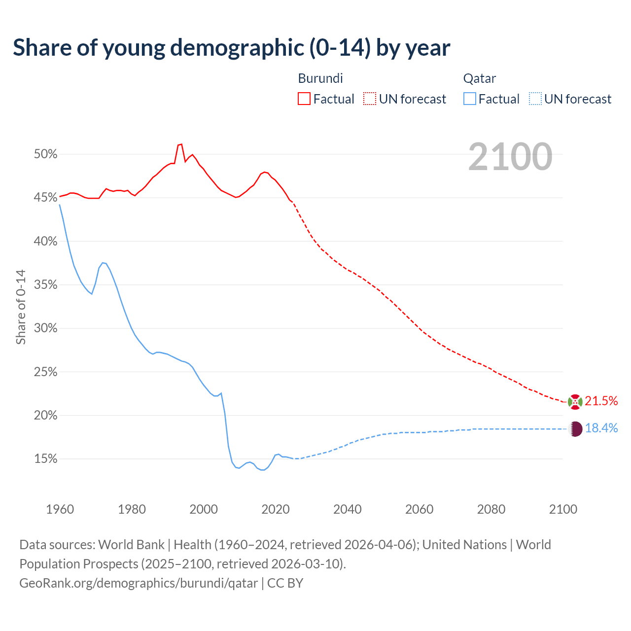 - The share of young demographic (0-15 years old) in Burundi is 44.7% vs 15.1% in Qatar.