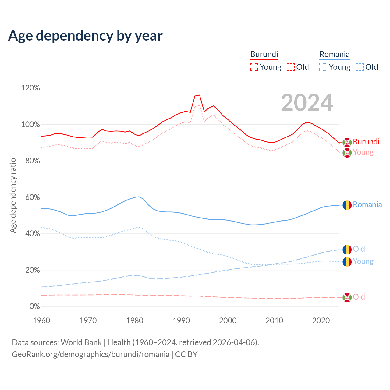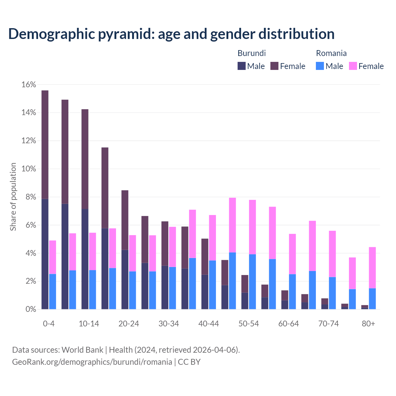 - Burundi is ranked 190/196 by median age (oldest to youngest) vs 23/196 for Romania.