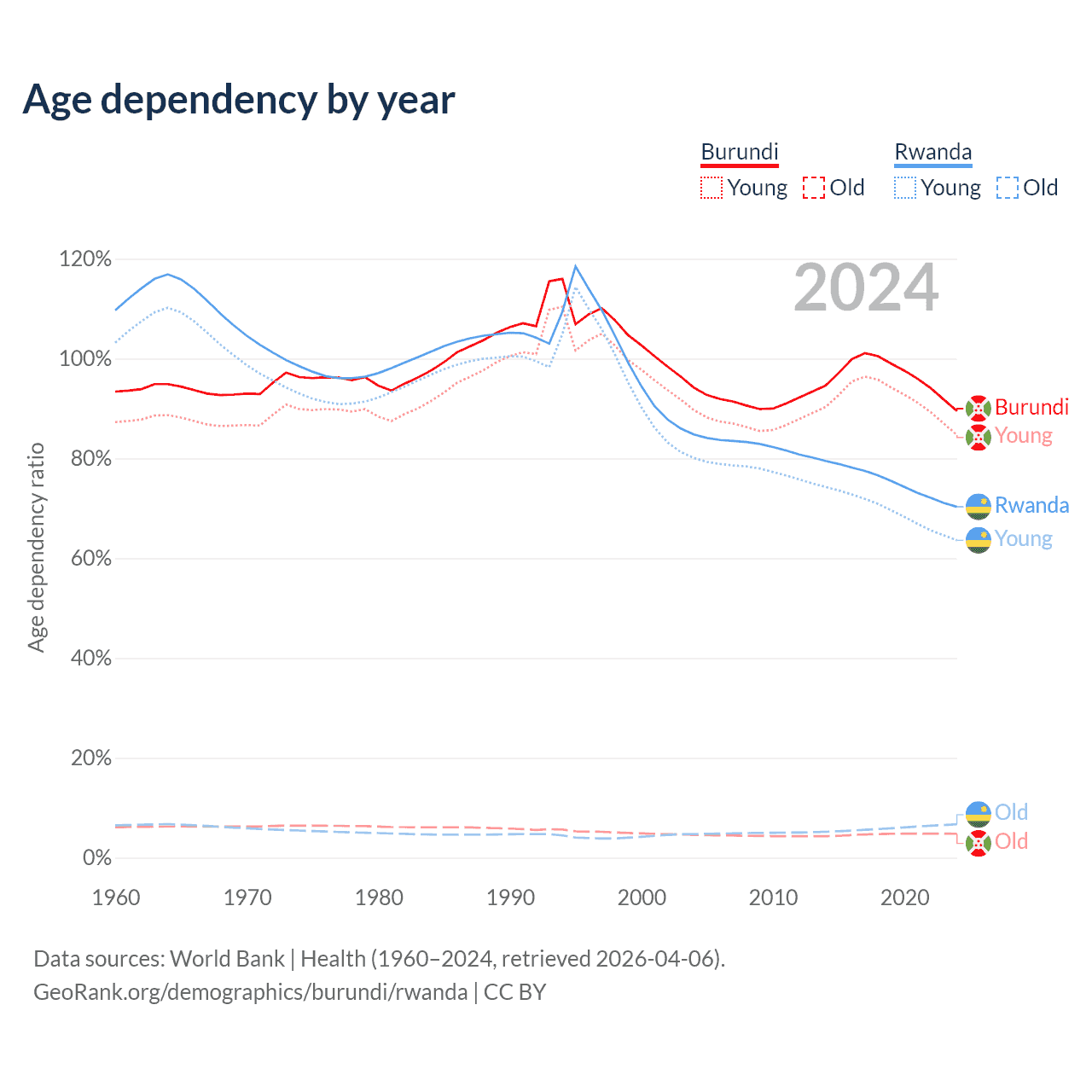 - Burundi is ranked 190/196 by median age (oldest to youngest) vs 160/196 for Rwanda.