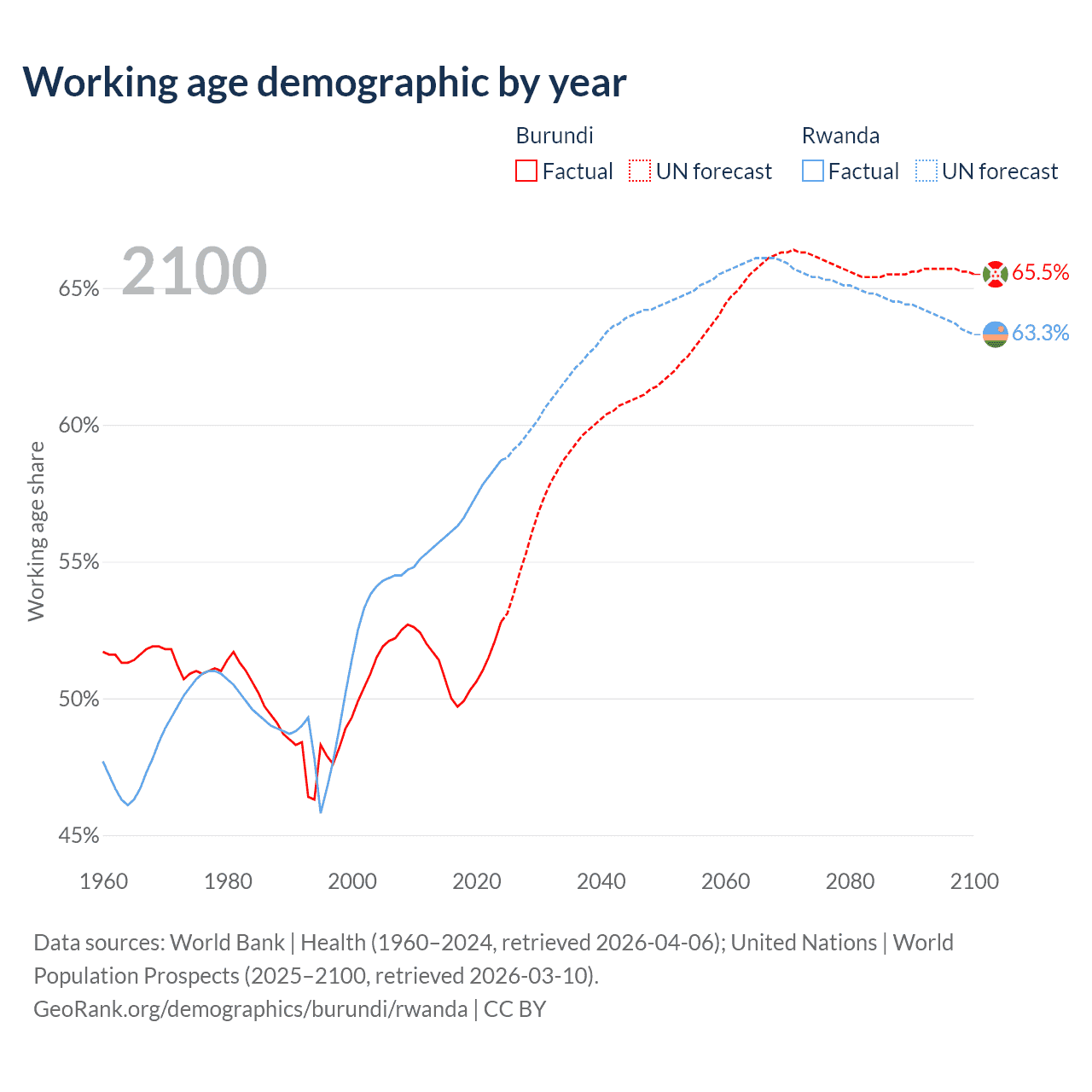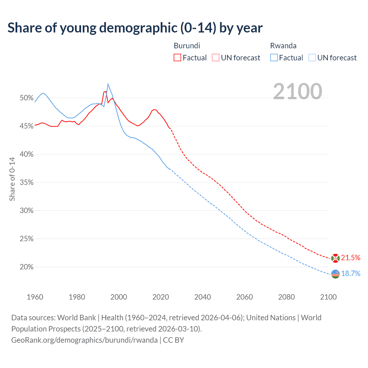Median age Burundi vs Rwanda, 1960-2100