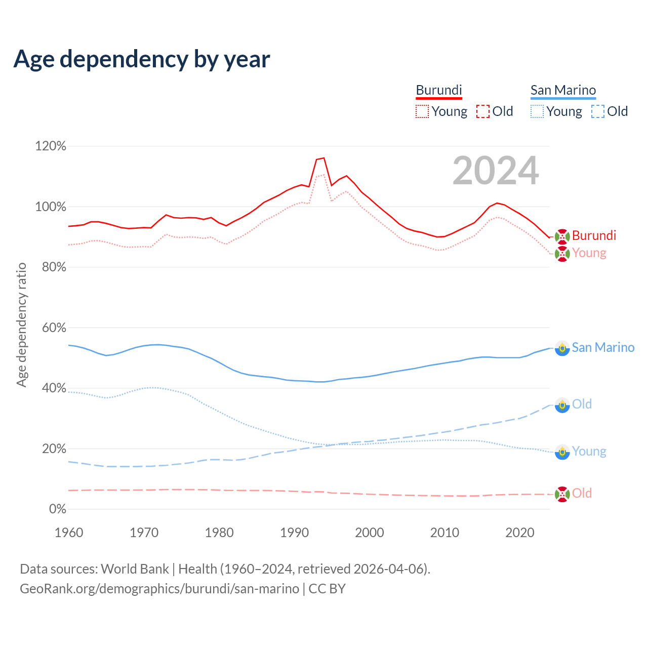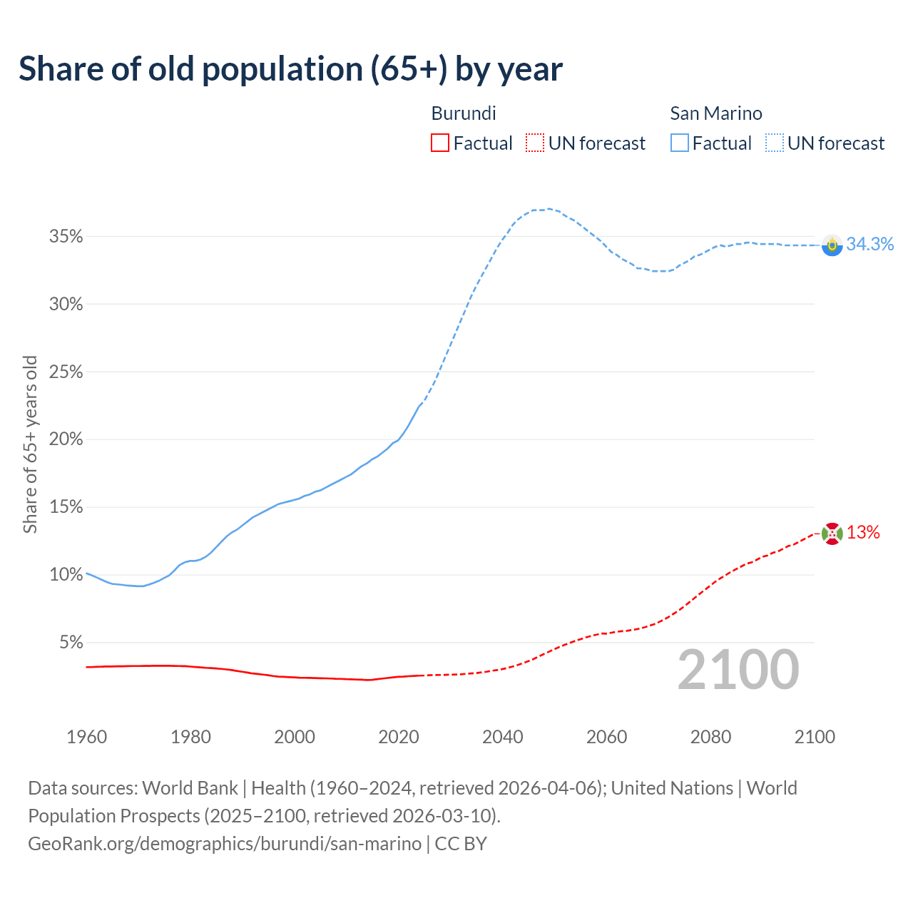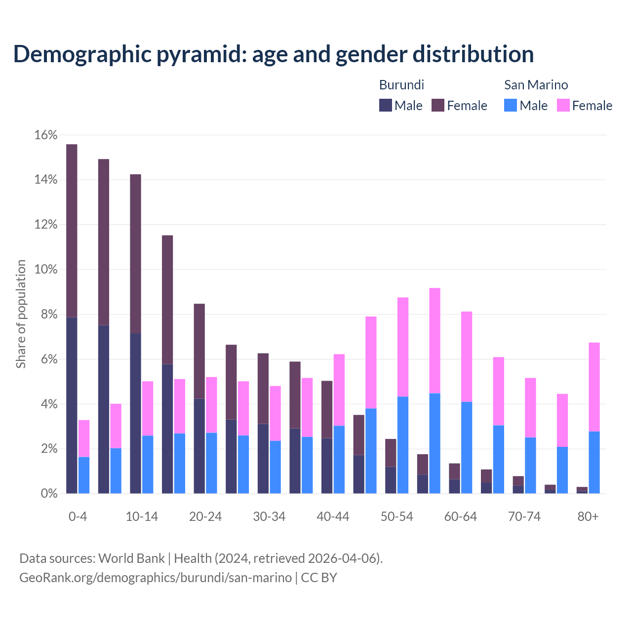 - The share of old-age demographic (65+) in Burundi is 2.53% vs 22.4% in San Marino.