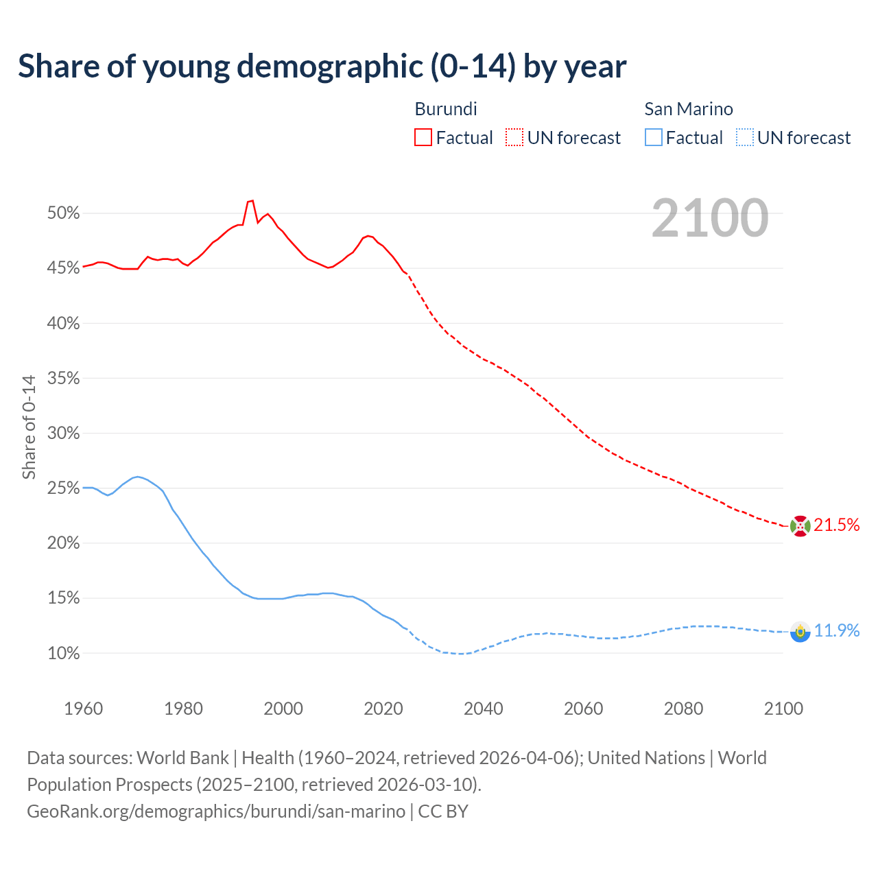 - The share of young demographic (0-15 years old) in Burundi is 44.7% vs 12.3% in San Marino.