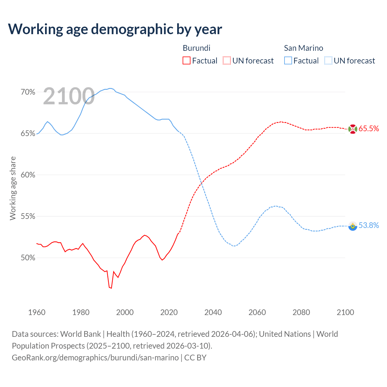 - Burundi has 7.83M working age adults (aged 15-64) vs 22.2K in San Marino.