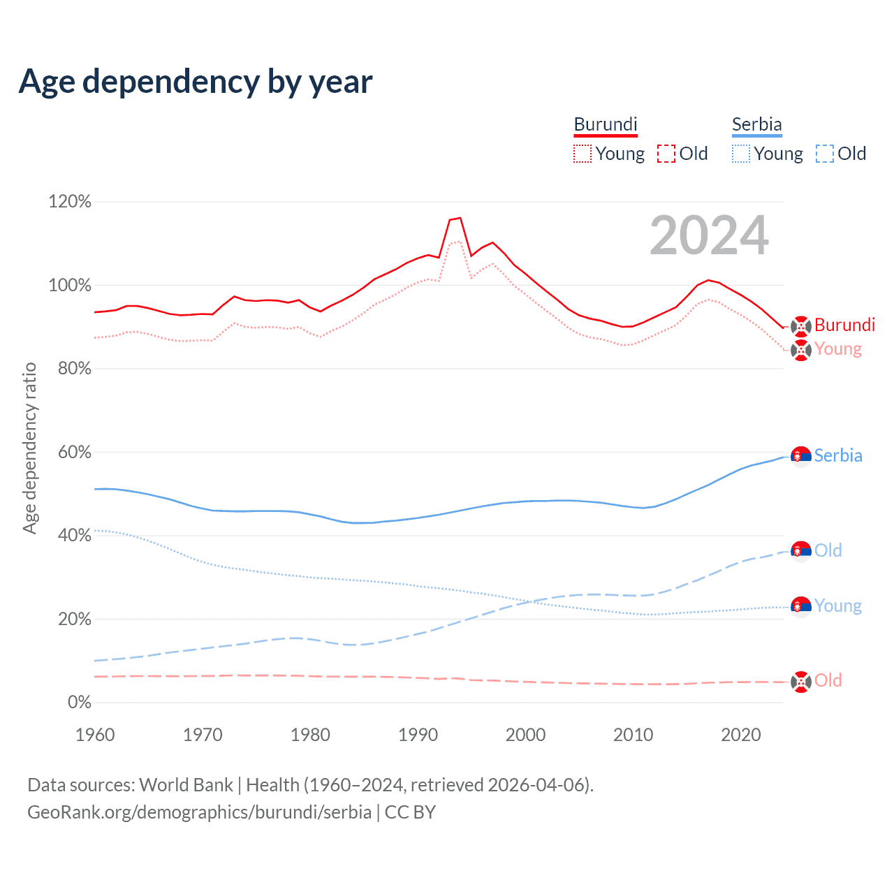 - Burundi is ranked 190/196 by median age (oldest to youngest) vs 15/196 for Serbia.