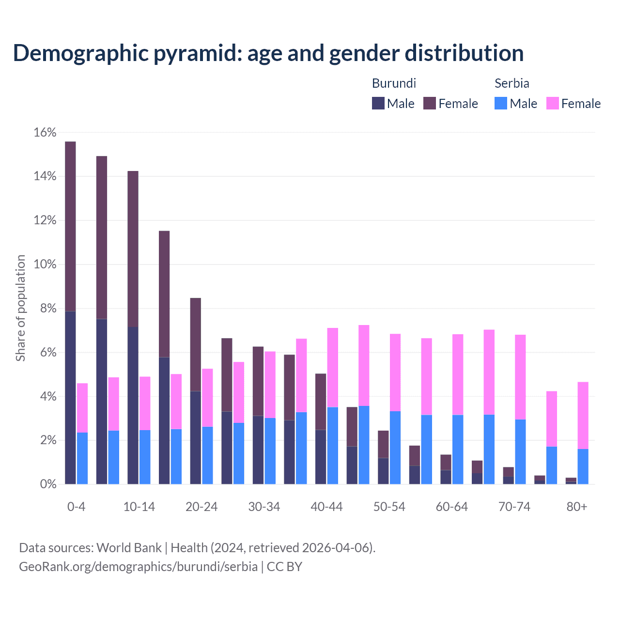 - As of 2026, the population of Burundi is 14.8M vs 6.49M in Serbia - 2.28 times difference.