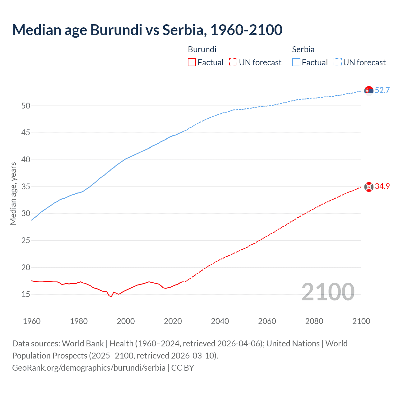 - The median age in Burundi is 17.3 years compared to 45.1 years in Serbia.