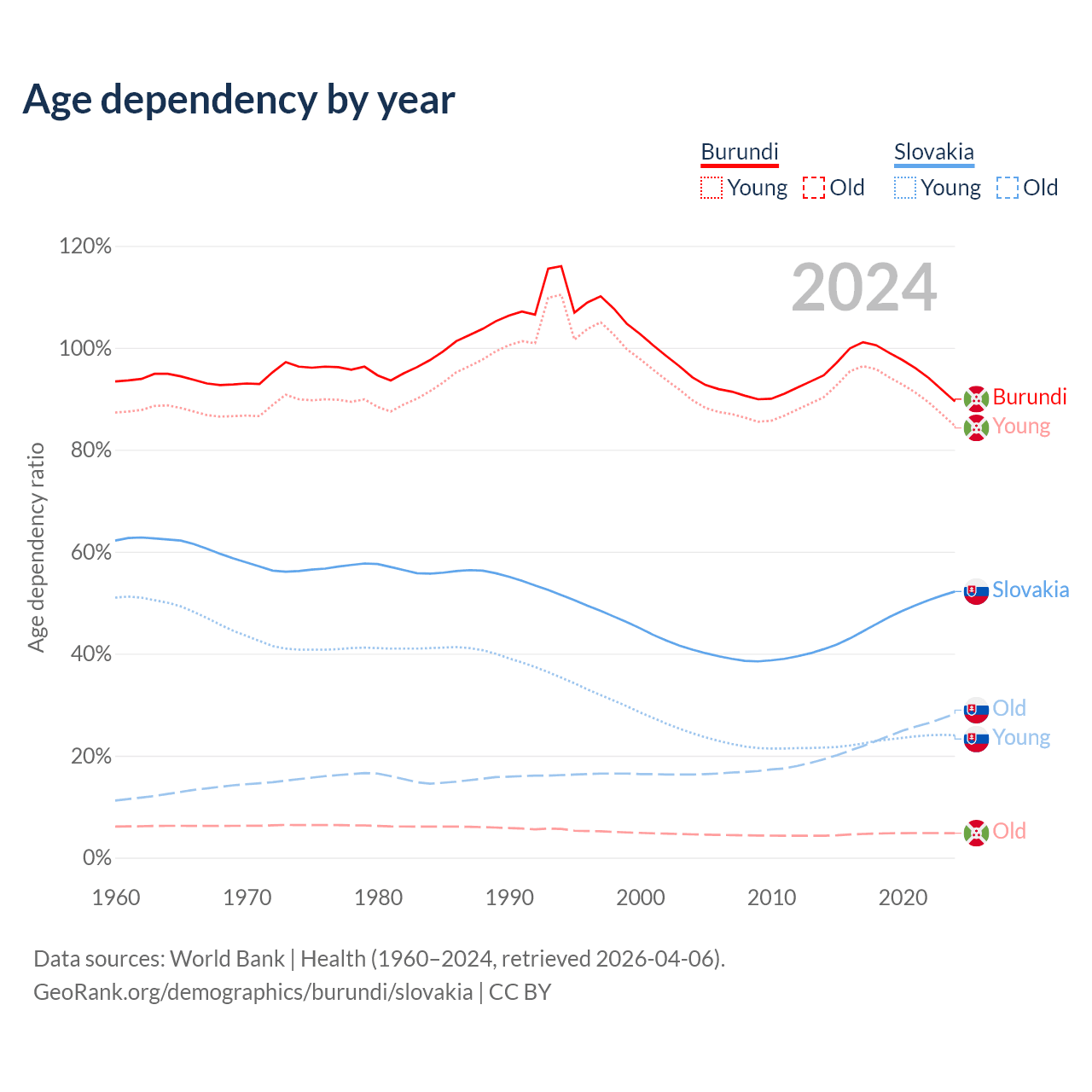 - The share of old-age demographic (65+) in Burundi is 2.53% vs 18.5% in Slovakia.