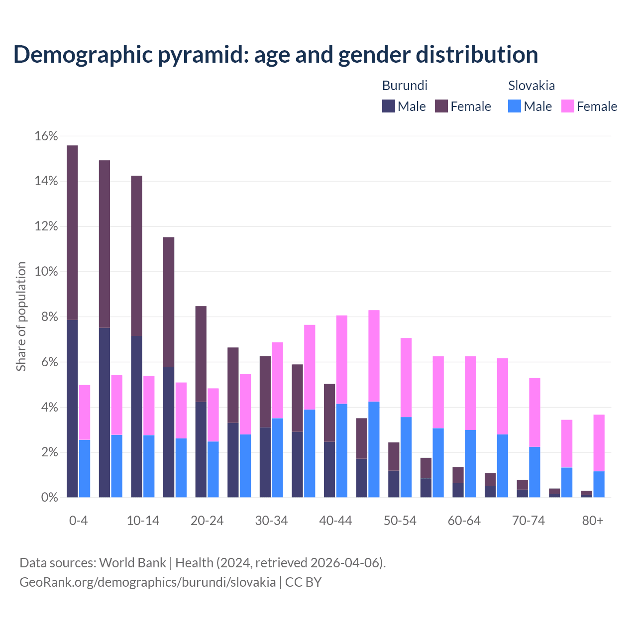 - The share of young demographic (0-15 years old) in Burundi is 44.7% vs 15.8% in Slovakia.