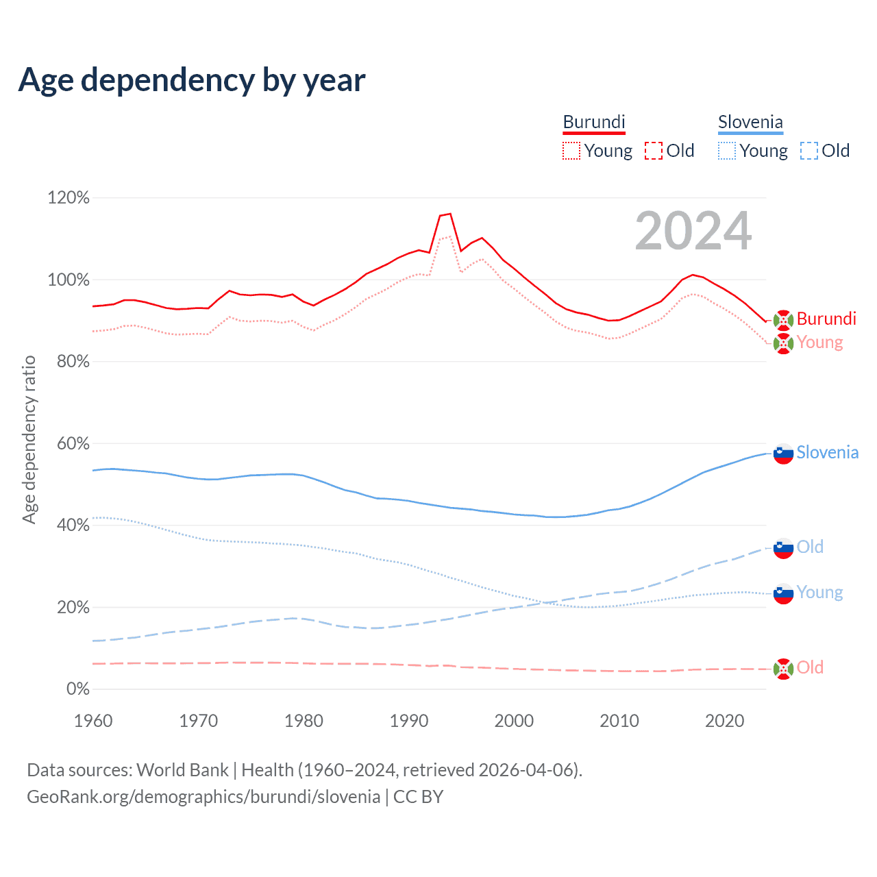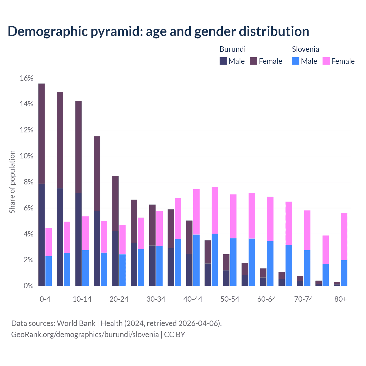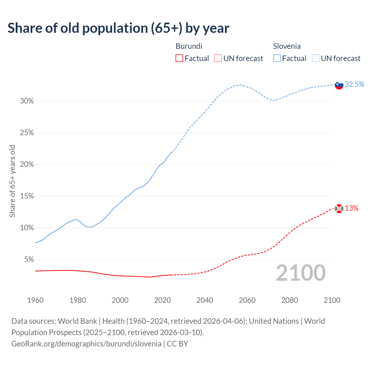 - The share of old-age demographic (65+) in Burundi is 2.53% vs 21.8% in Slovenia.