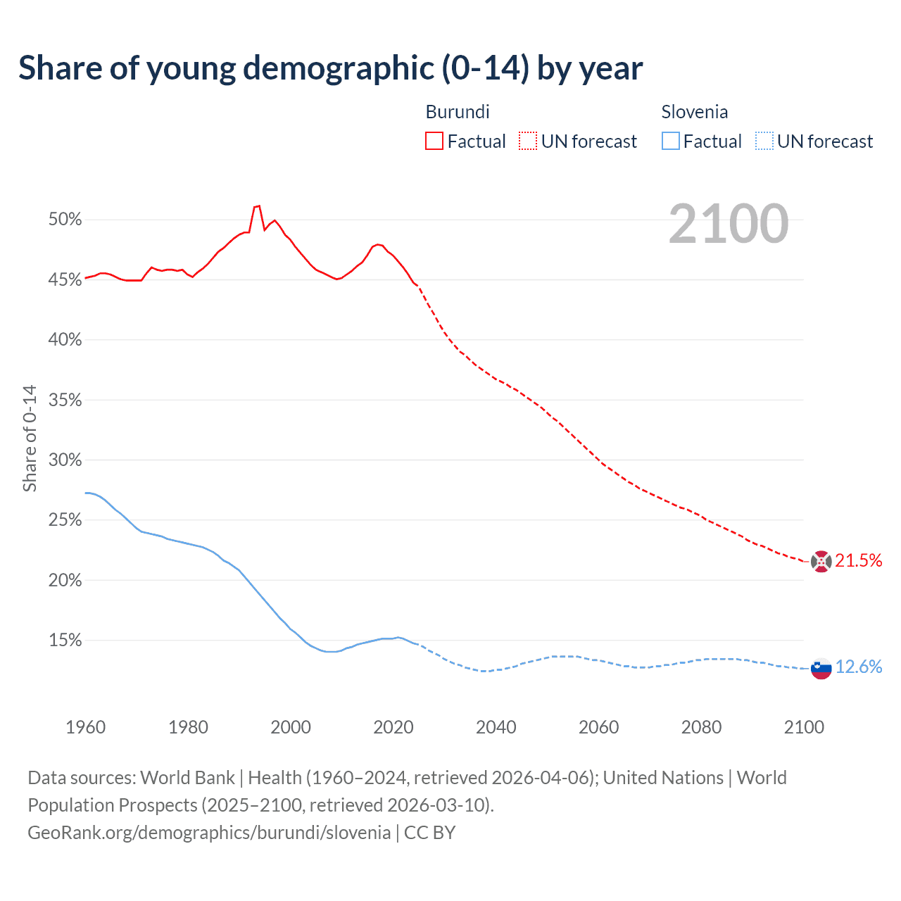 - The share of young demographic (0-15 years old) in Burundi is 44.7% vs 14.7% in Slovenia.