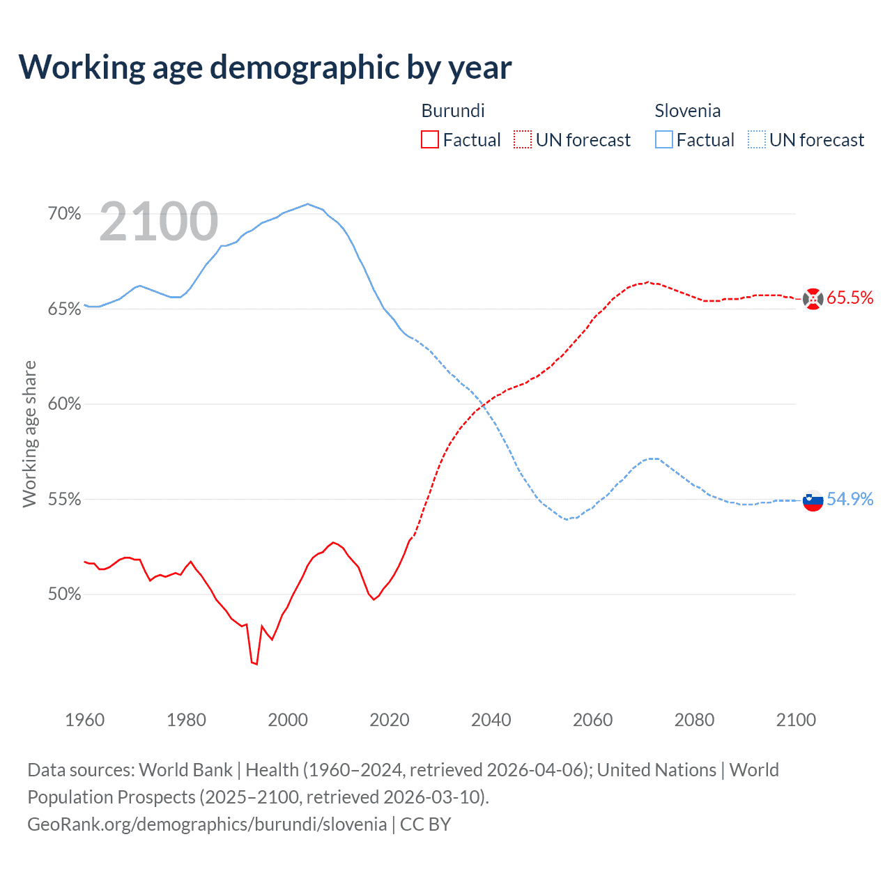 Median age Burundi vs Slovenia, 1960-2100