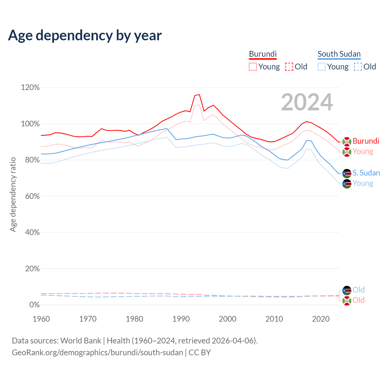 - Burundi is ranked 190/196 by median age (oldest to youngest) vs 173/196 for South Sudan.