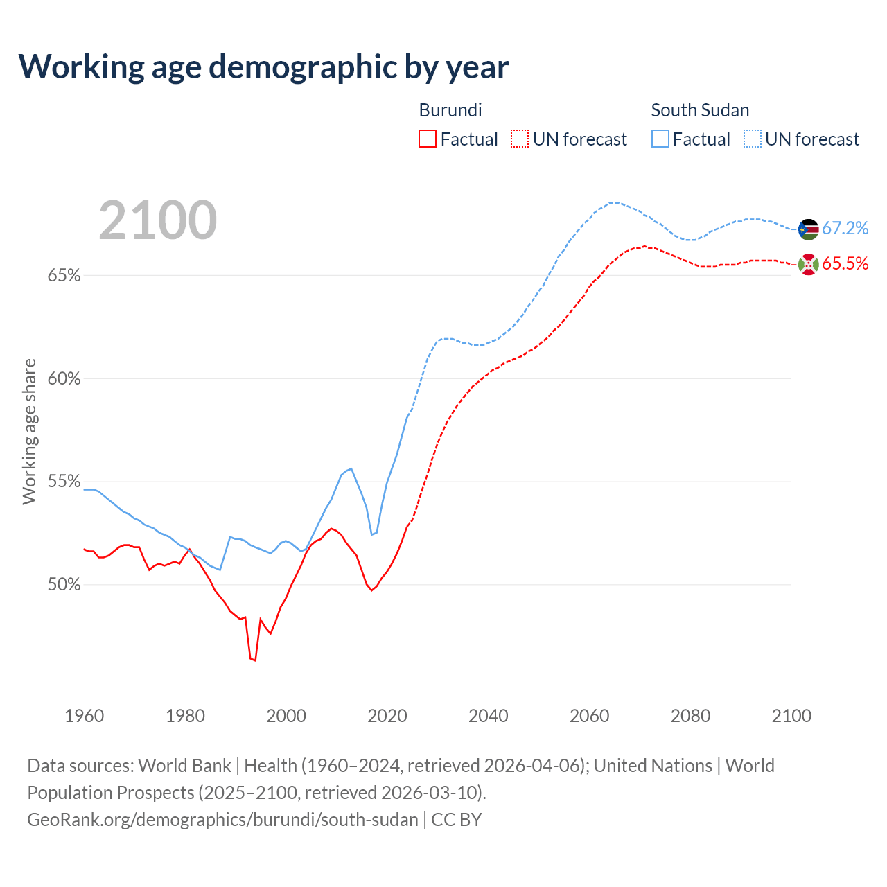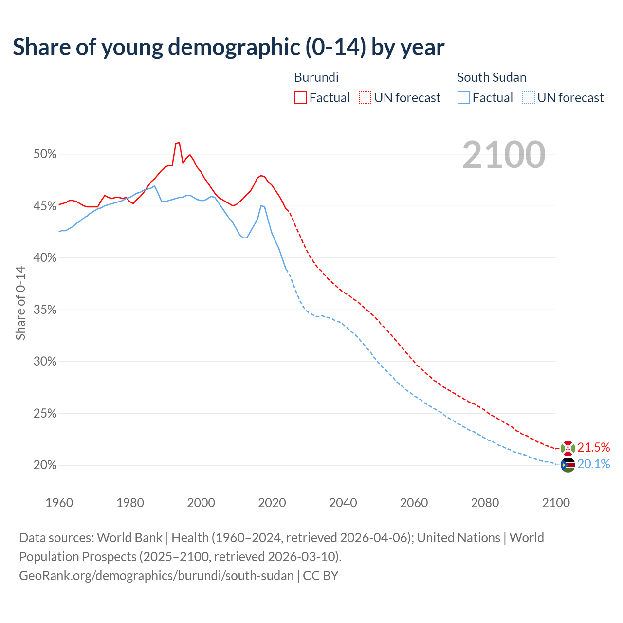Median age Burundi vs South Sudan, 1960-2100