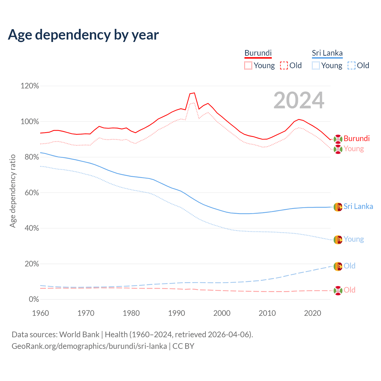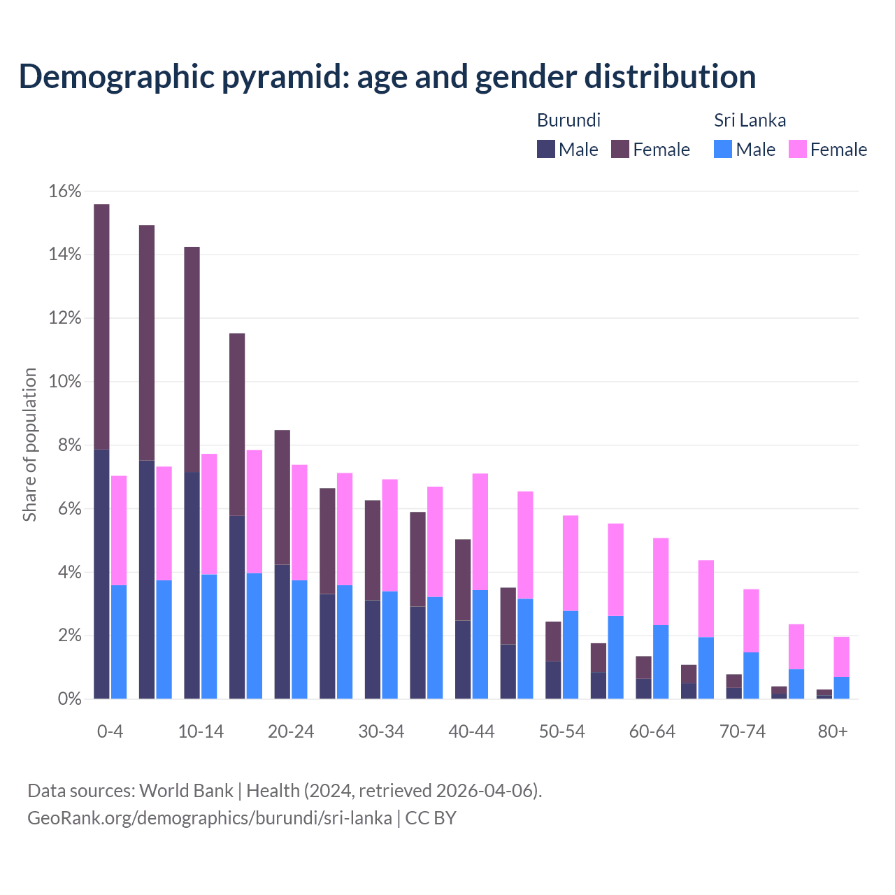 - Burundi is ranked 190/196 by median age (oldest to youngest) vs 81/196 for Sri Lanka.