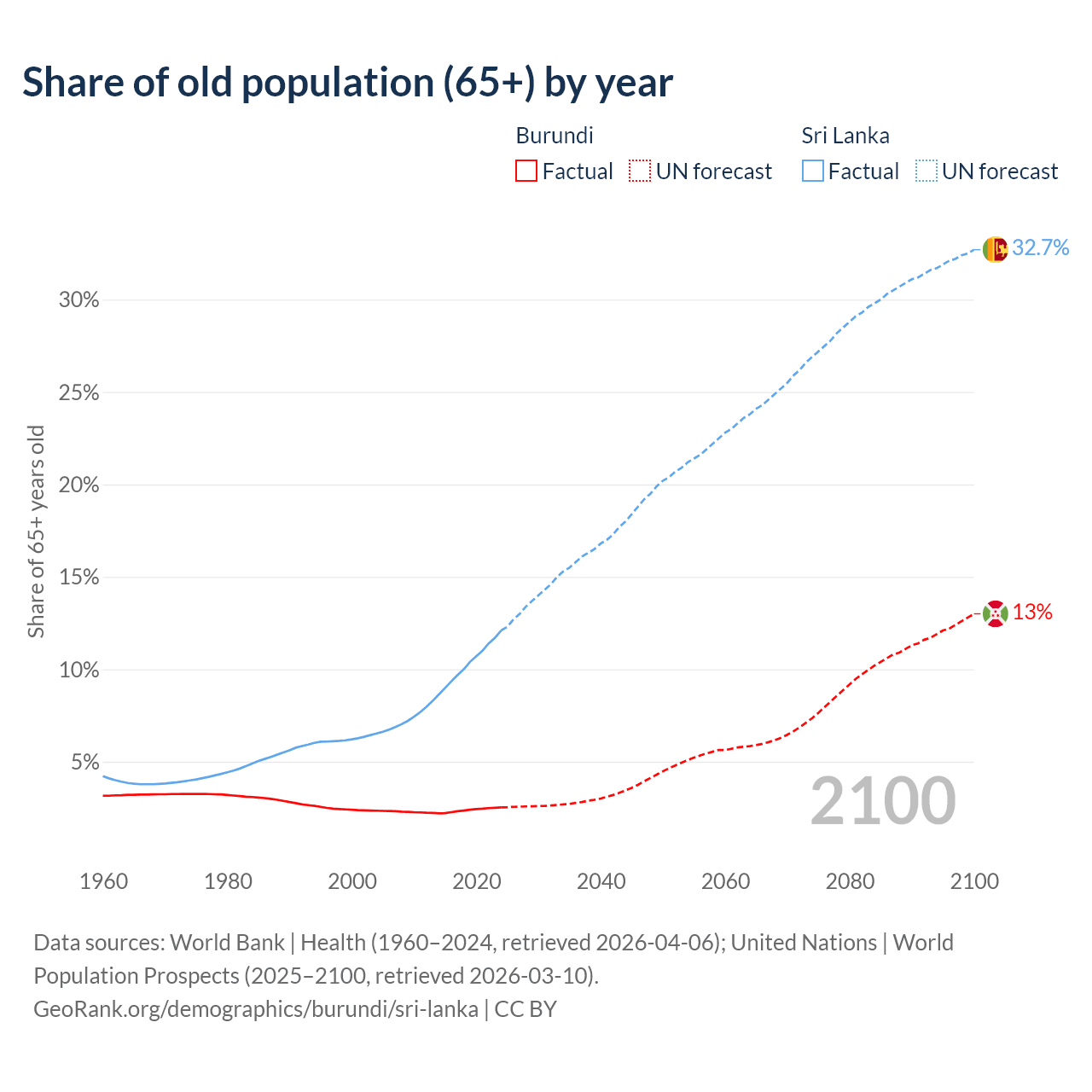 - The share of old-age demographic (65+) in Burundi is 2.53% vs 12.1% in Sri Lanka.
