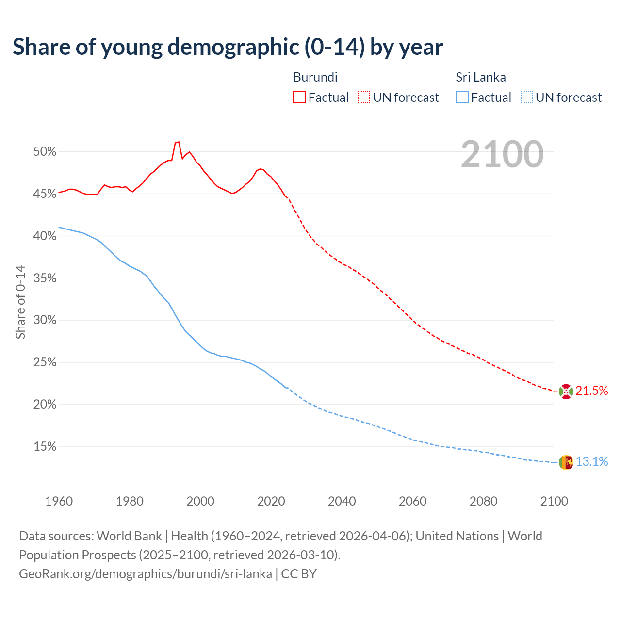 - The share of young demographic (0-15 years old) in Burundi is 44.7% vs 22% in Sri Lanka.
