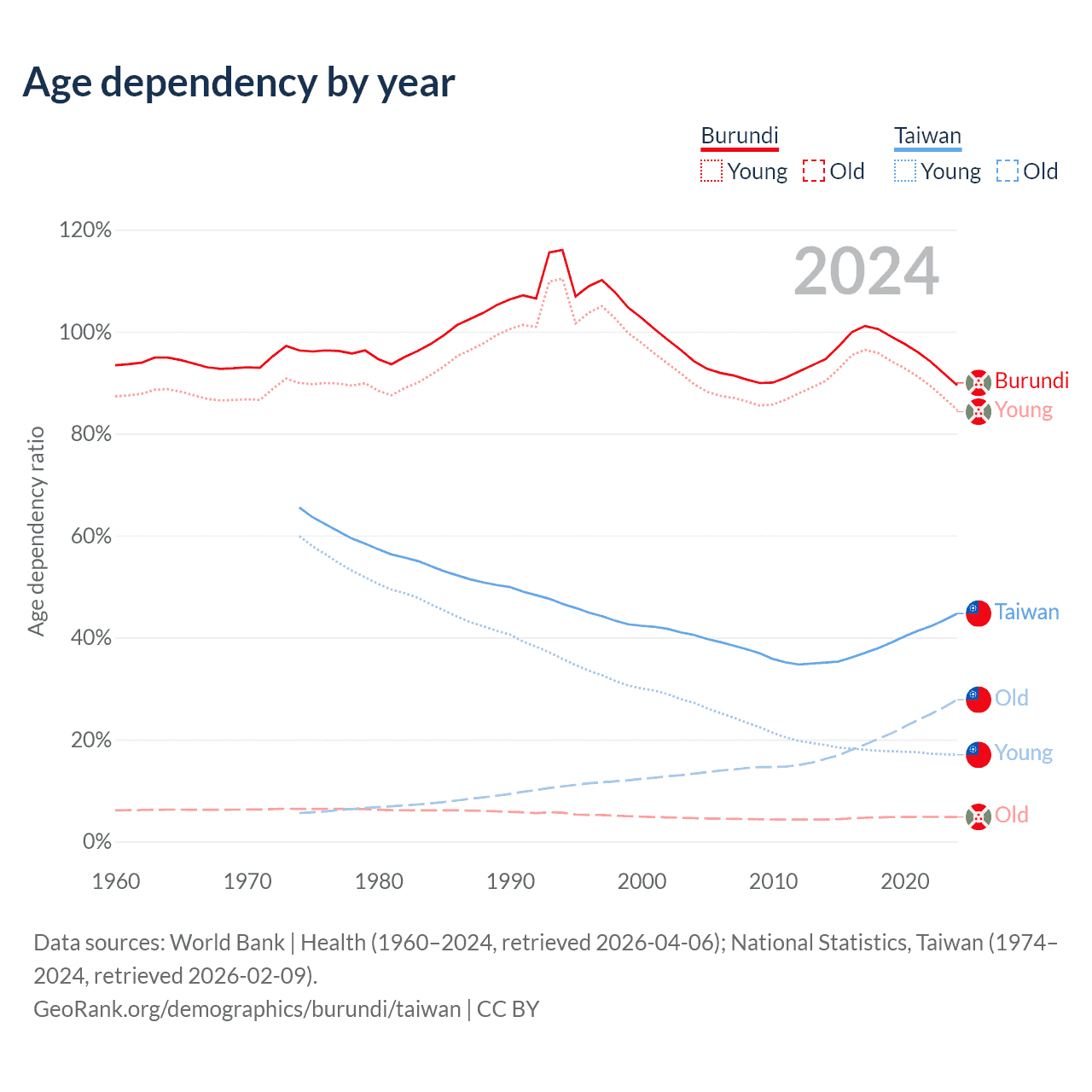 Data sources: World Bank | Health (1960–2024, retrieved 2026-04-06); U.S. Census Bureau (1960–2024, retrieved 2026-02-08); National Statistics, Taiwan (1974–2024, retrieved 2026-02-09).