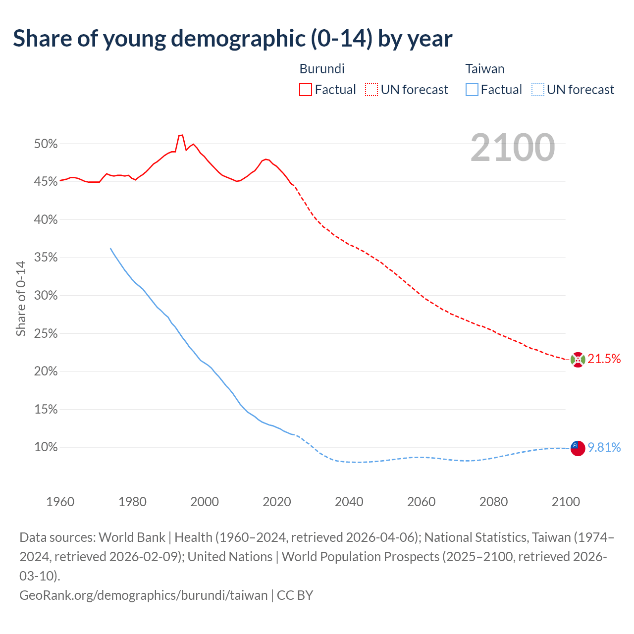 - The share of young demographic (0-15 years old) in Burundi is 44.7% vs 11.7% in Taiwan.