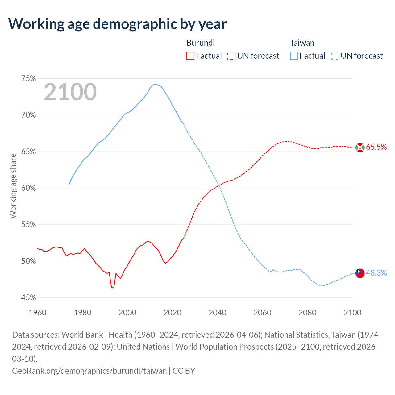 The share of older people aged 65 and over is 2.53% in Burundi and 19.2% in Taiwan. Life expectancy in Burundi compared to Taiwan .