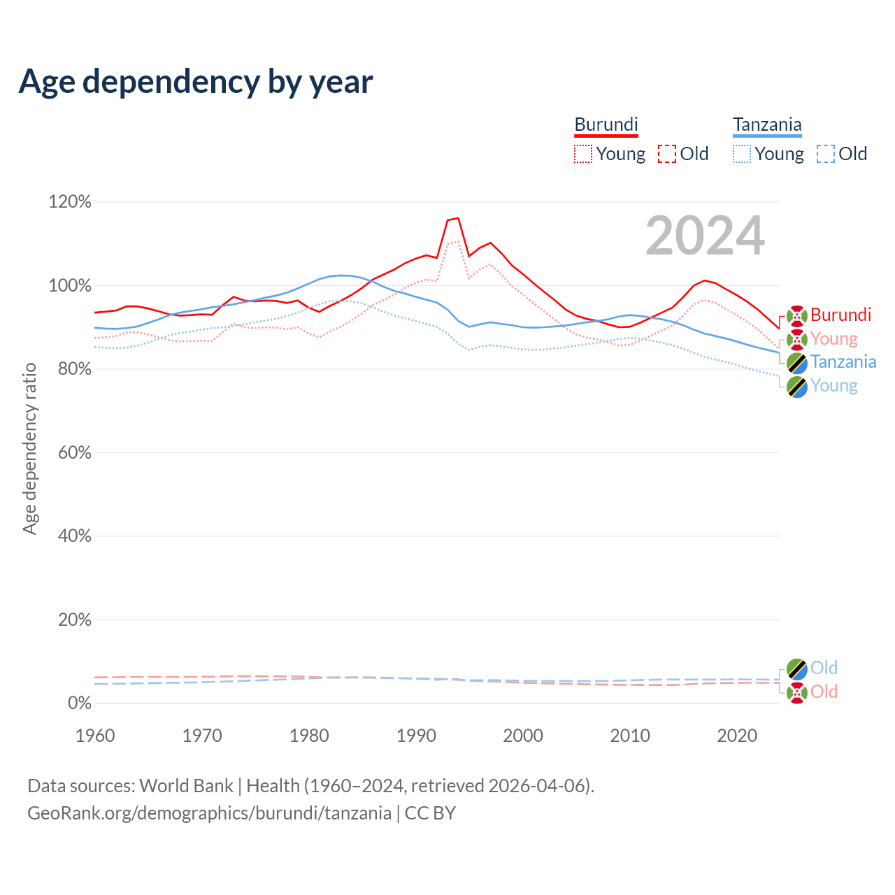 - Burundi is ranked 190/196 by median age (oldest to youngest) vs 184/196 for Tanzania.