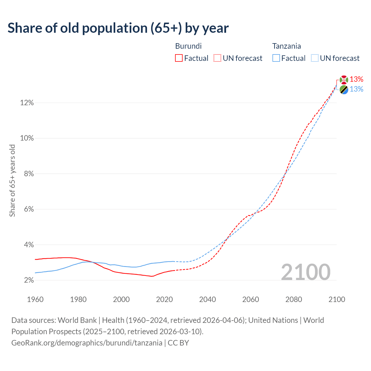 The share of older people aged 65 and over is 2.53% in Burundi and 3.05% in Tanzania. Life expectancy in Burundi compared to Tanzania .