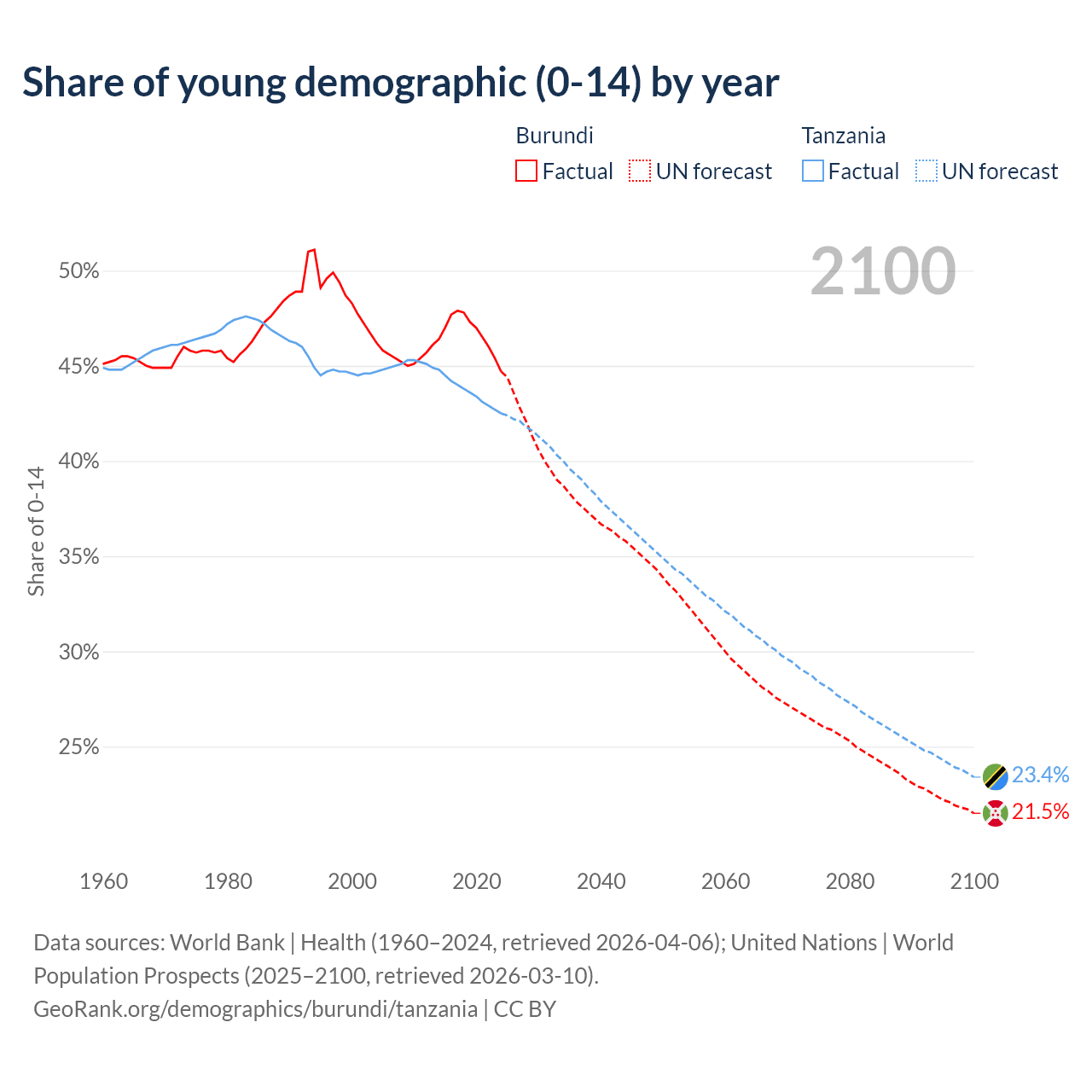 - The share of young demographic (0-15 years old) in Burundi is 44.7% vs 42.5% in Tanzania.