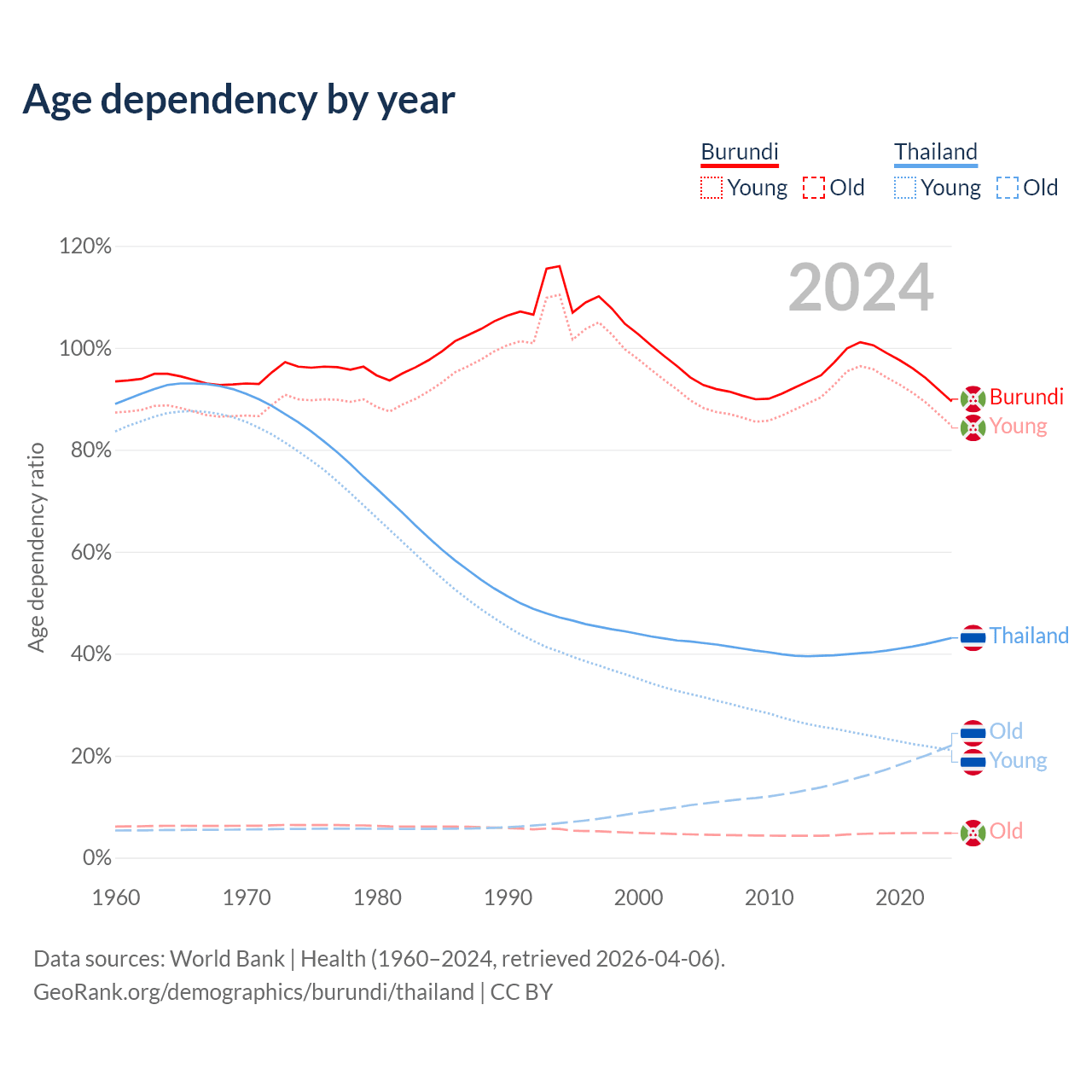 - Burundi is ranked 190/196 by median age (oldest to youngest) vs 40/196 for Thailand.