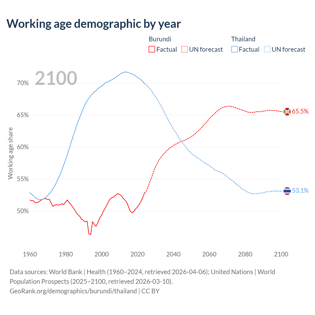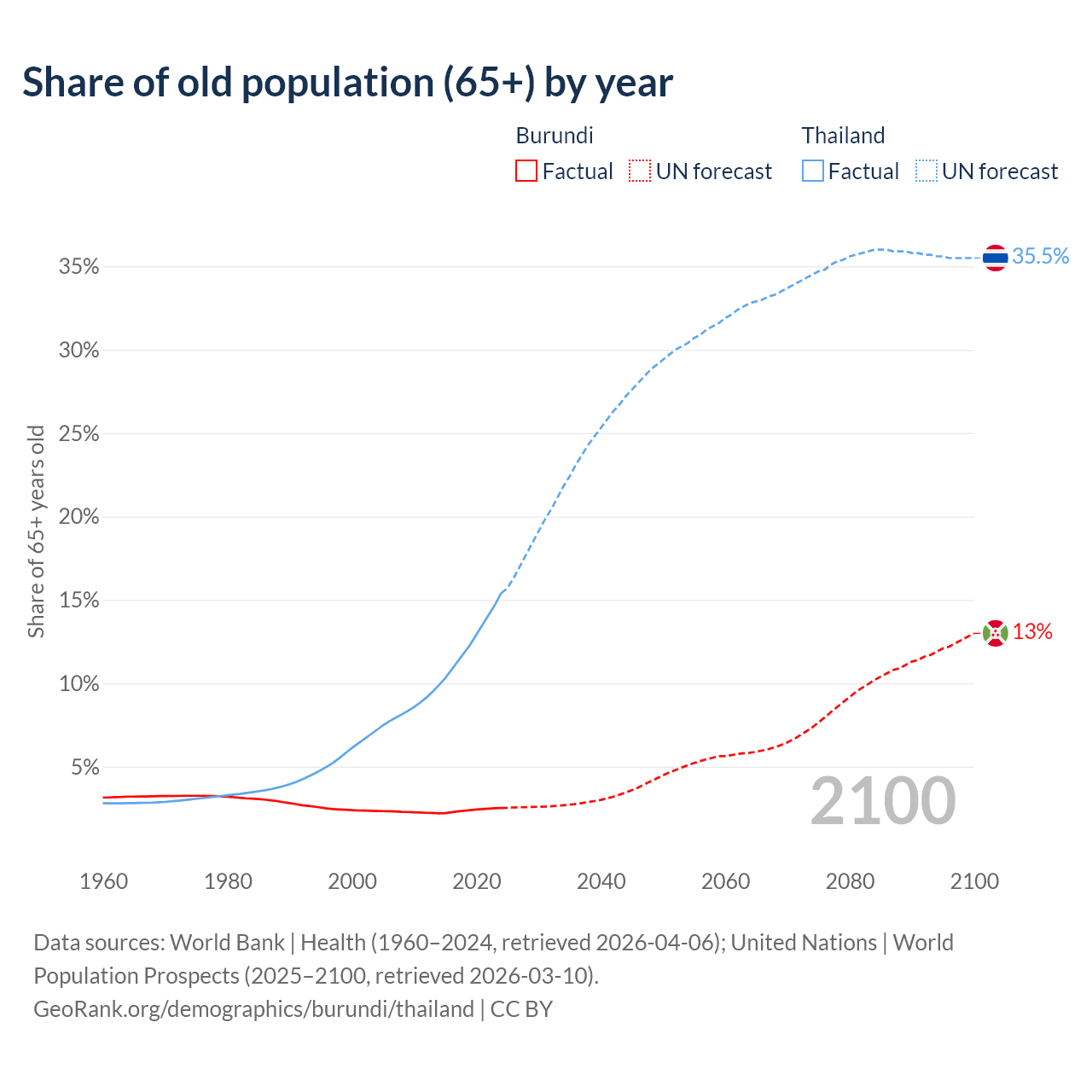 The share of older people aged 65 and over is 2.53% in Burundi and 15.4% in Thailand. Life expectancy in Burundi compared to Thailand .