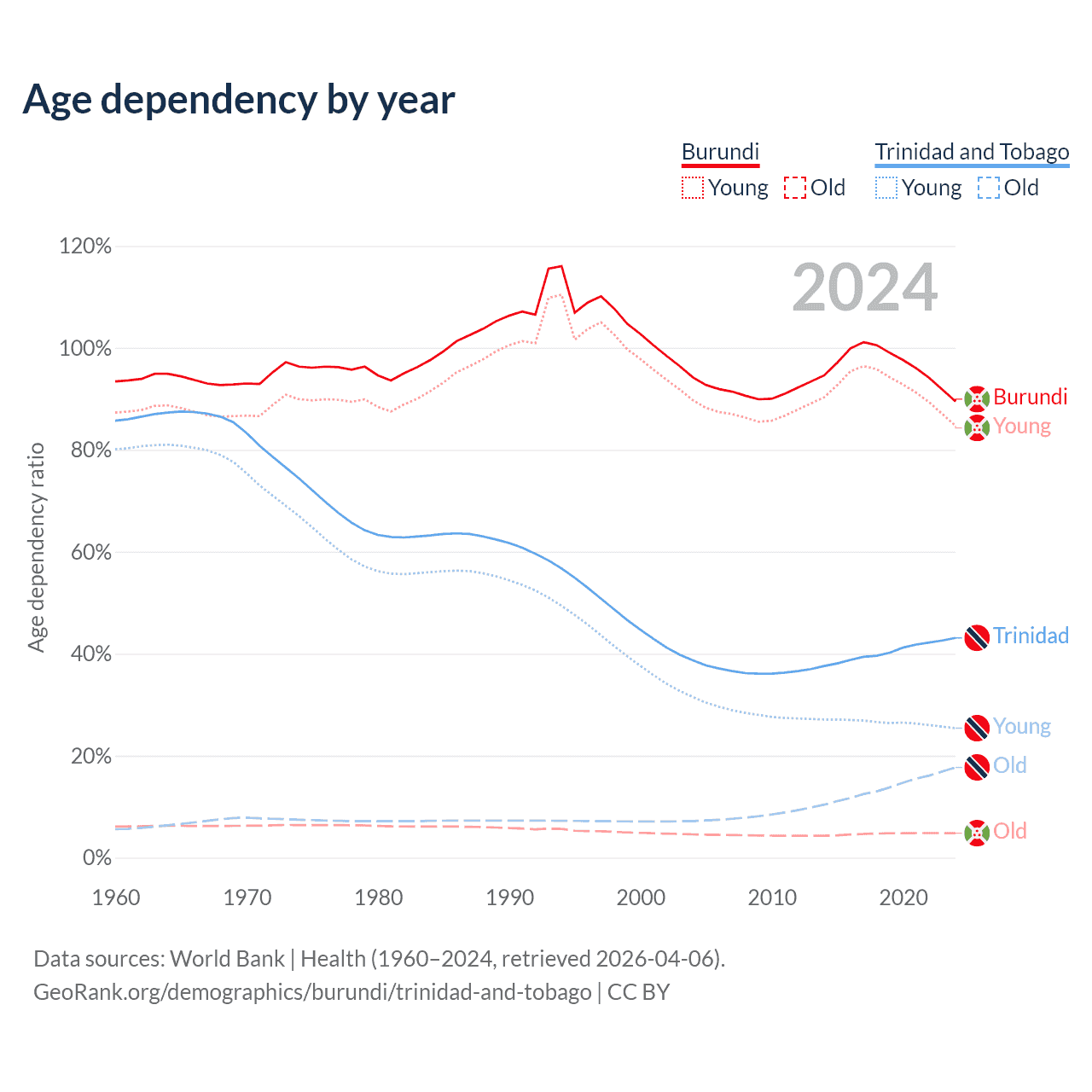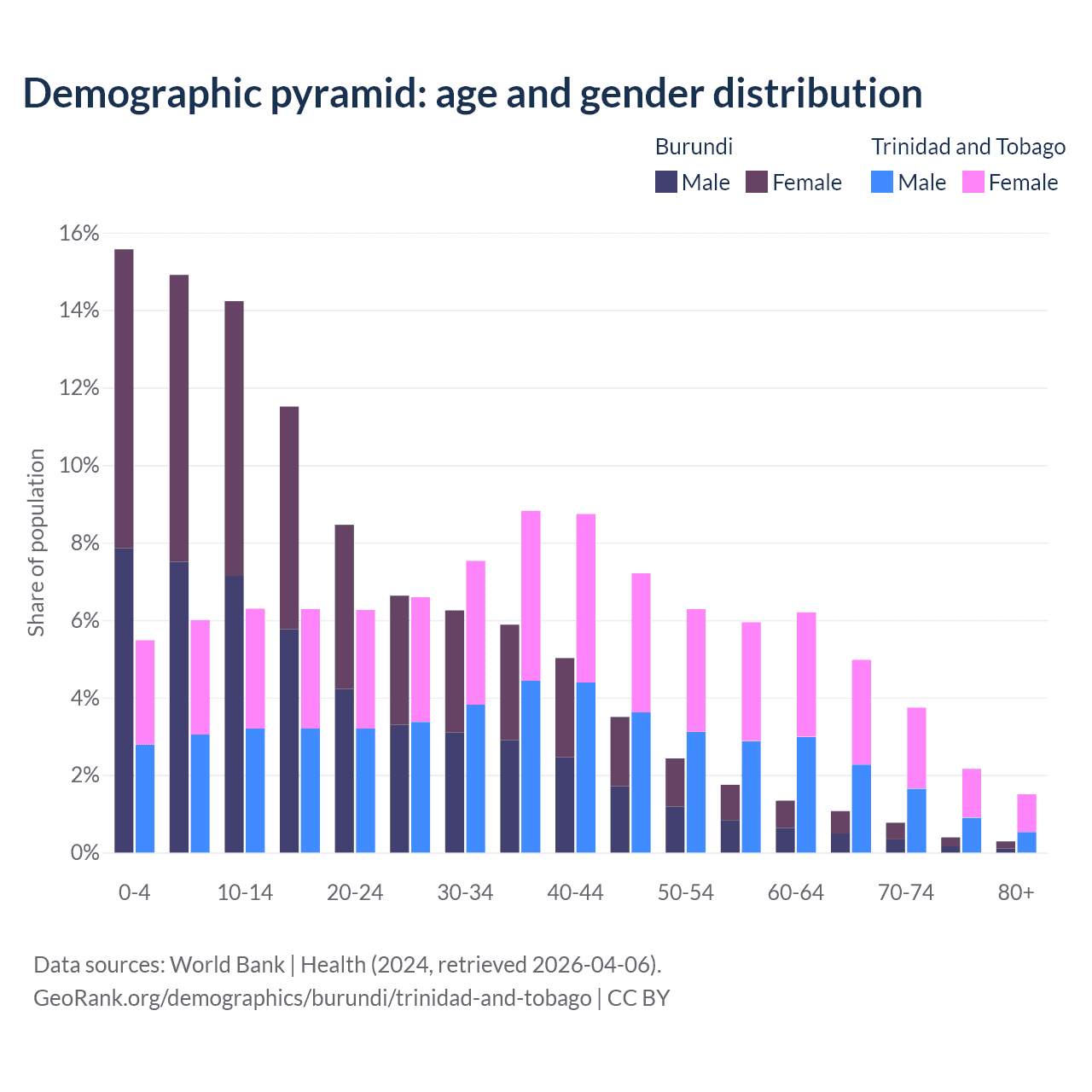 - Burundi is ranked 190/196 by median age (oldest to youngest) vs 58/196 for Trinidad and Tobago.