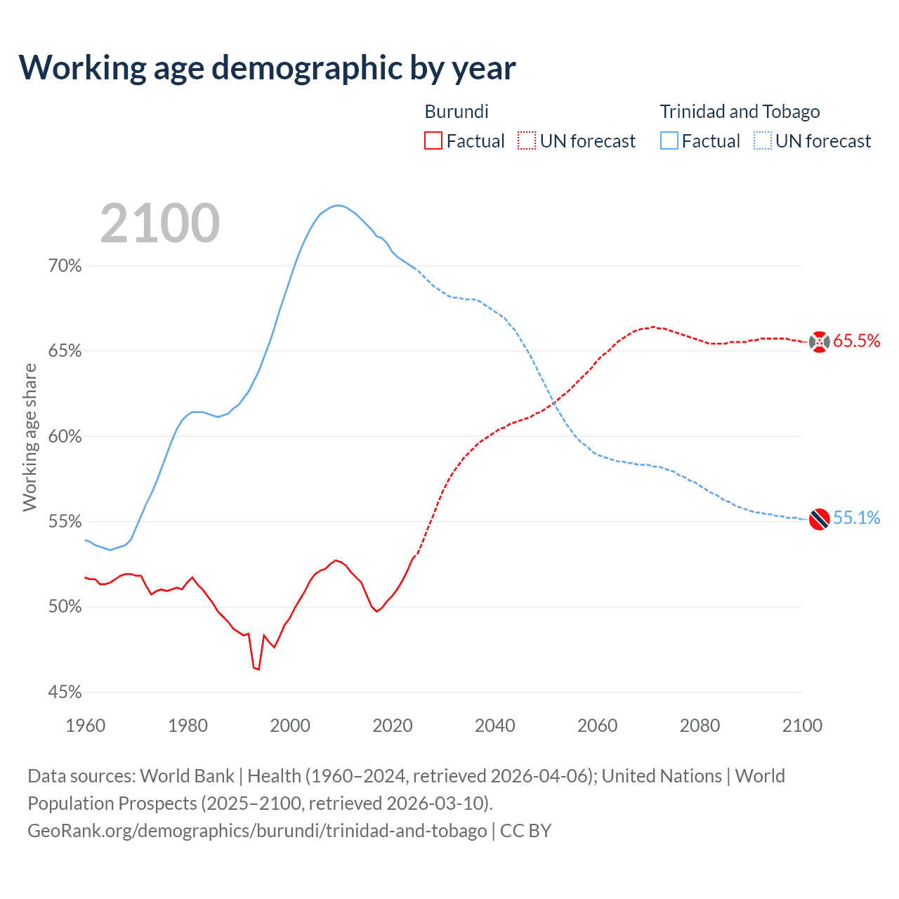 - Burundi has 7.83M working age adults (aged 15-64) vs 960K in Trinidad and Tobago.