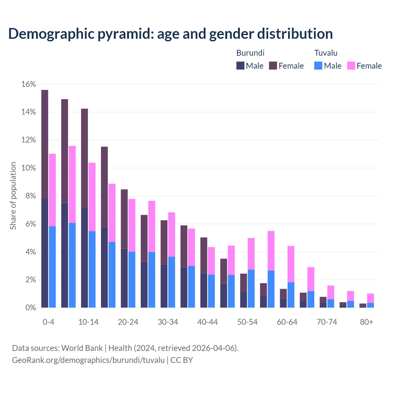 - As of 2026, the population of Burundi is 14.8M vs 9.34K in Tuvalu - 1,588 times difference.